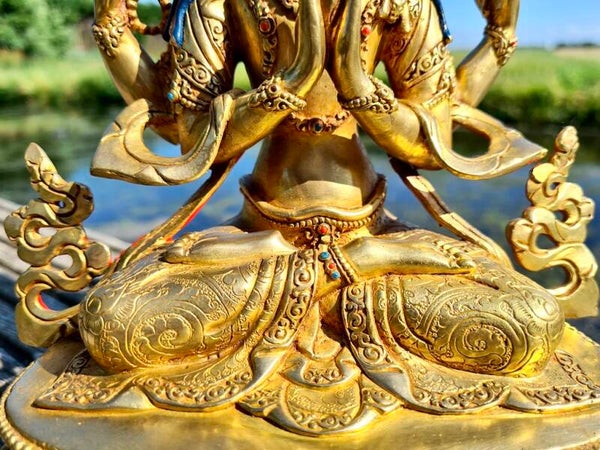 In zijn handen voor het hart houdt hij een juweel vast, een symbool van universele liefde en mededogen. Met dit symbool wil hij alle wezens ten goede komen. De kwaliteit van de geest van Chenrezig is nooit los geweest van de alles doordringende staat van diepgaande wijsheid.