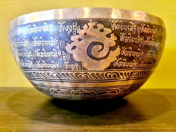 Handgemaakte gegraveerde klankschaal uit Nepal. Prachtig bewerkt met de afbeelding van een yantra in de binnenzijde.
