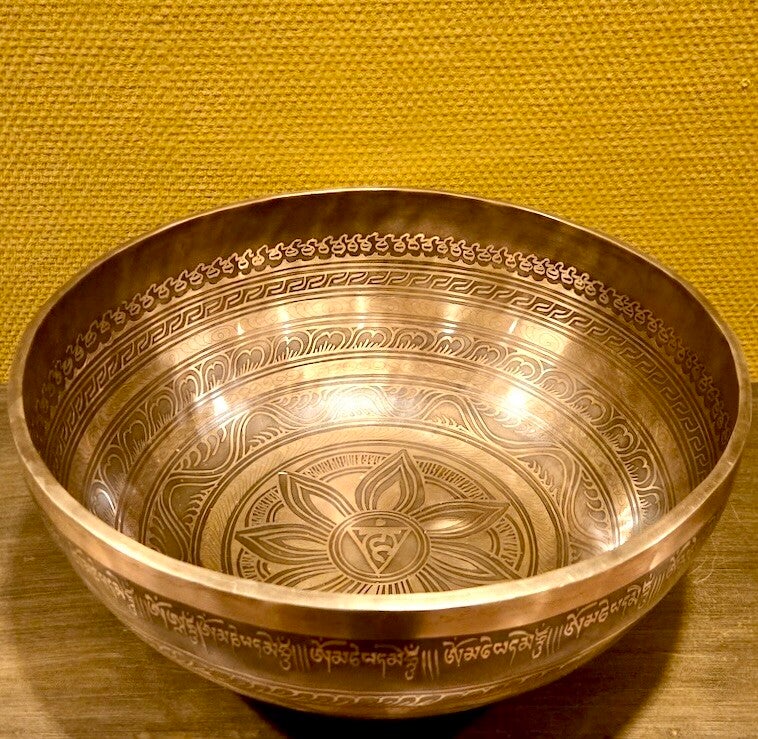 Een gedetailleerde handgemaakte klankschaal uit Nepal. Het is prachtig gegraveerd met de 'Om mani padme hum' mantra. 'Om mani padme hum', op de correcte wijze geschreven als 'Om manipadmé hum', is de meest gereciteerde mantra in het Tibetaans boeddhisme. Het is een invocatie, aanroeping van de bodhisattva Avalokitesvara, (De bezitter van) het Juweel-Lotus. De schaal heeft een zuivere klank met diverse boventonen. Aan de binnenkant het Ohm teken.