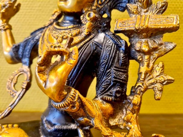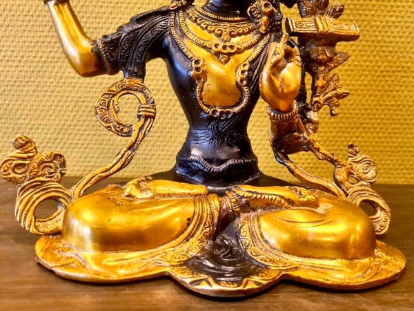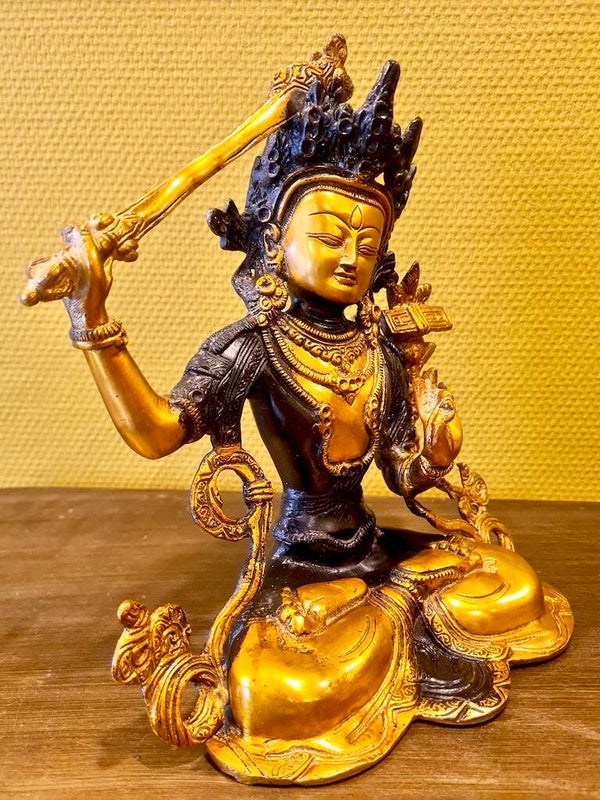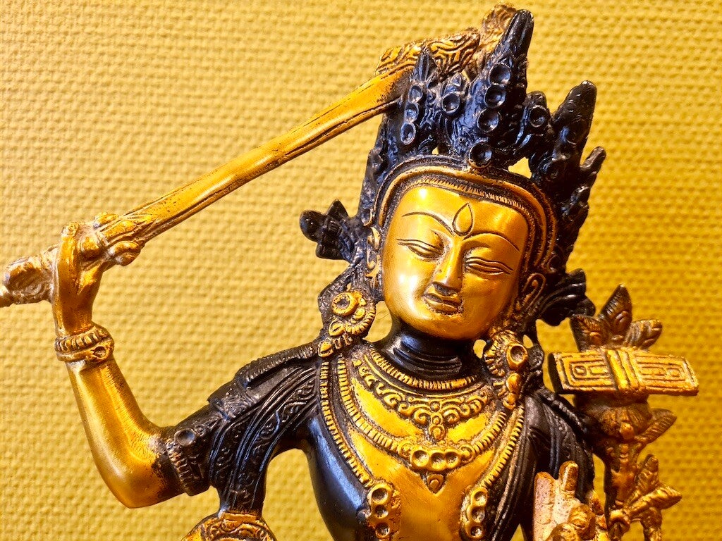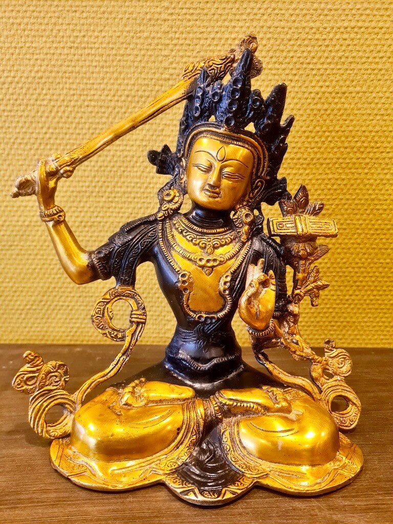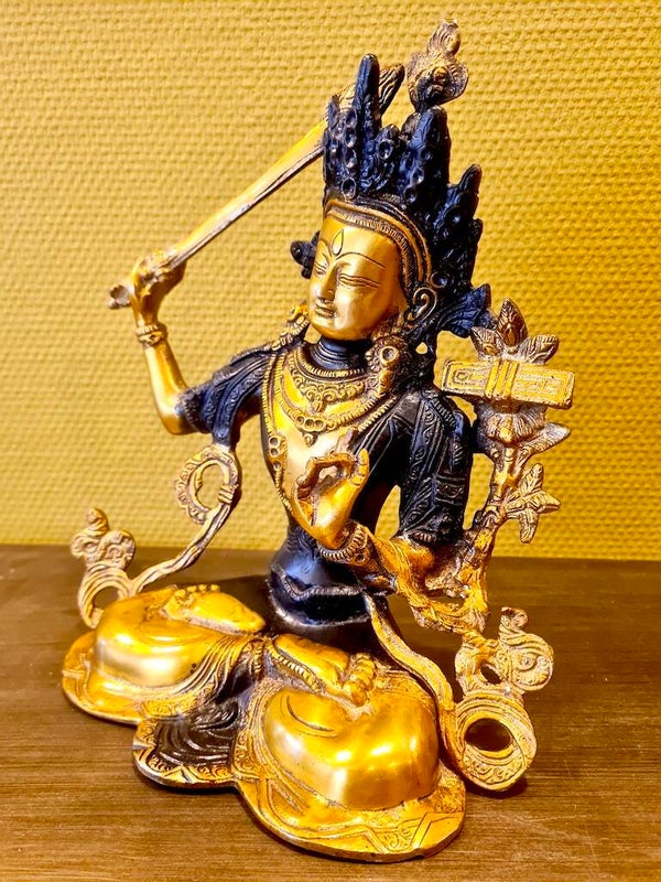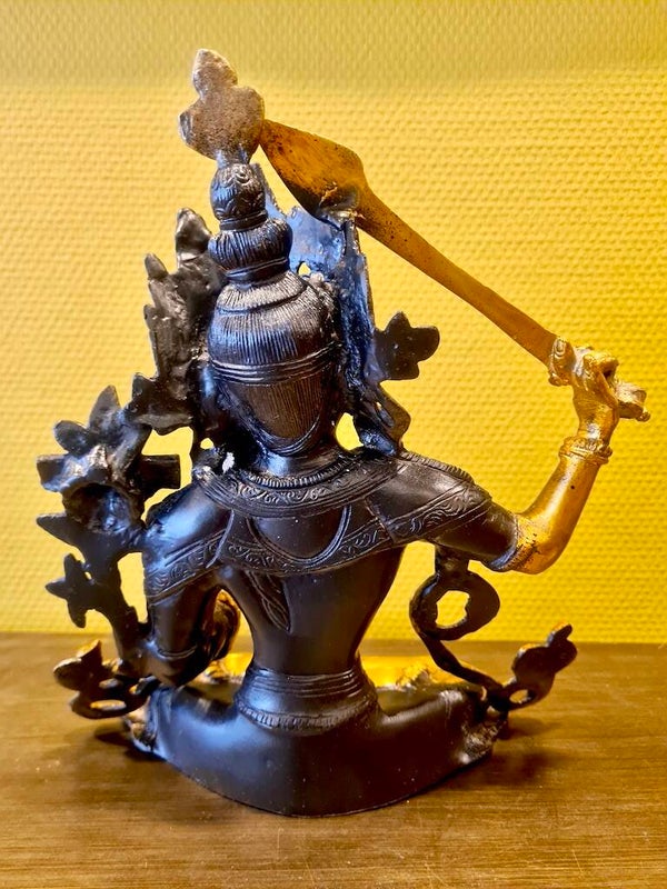 Een bronzen Manjushri beeld in exclusieve warme patina!