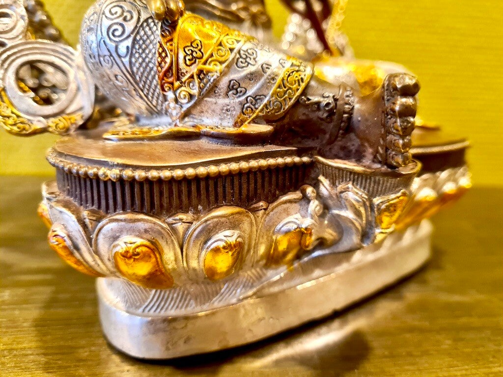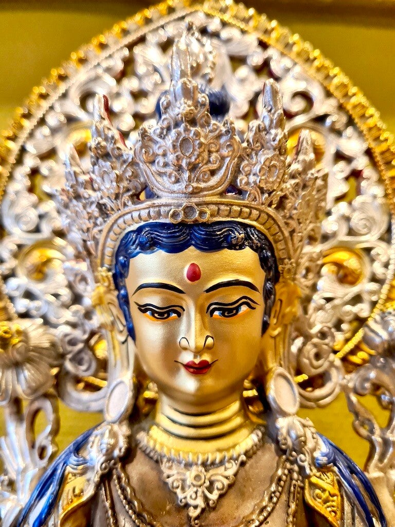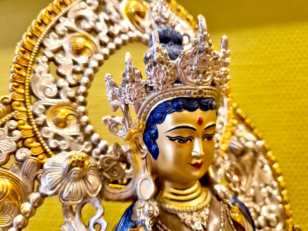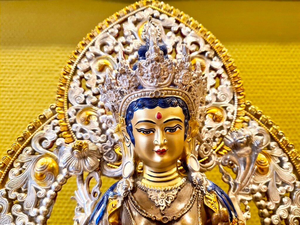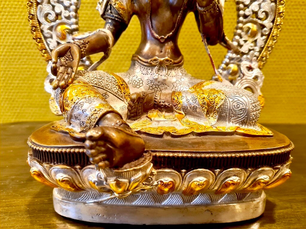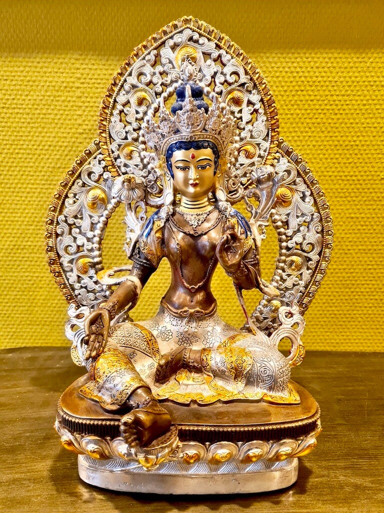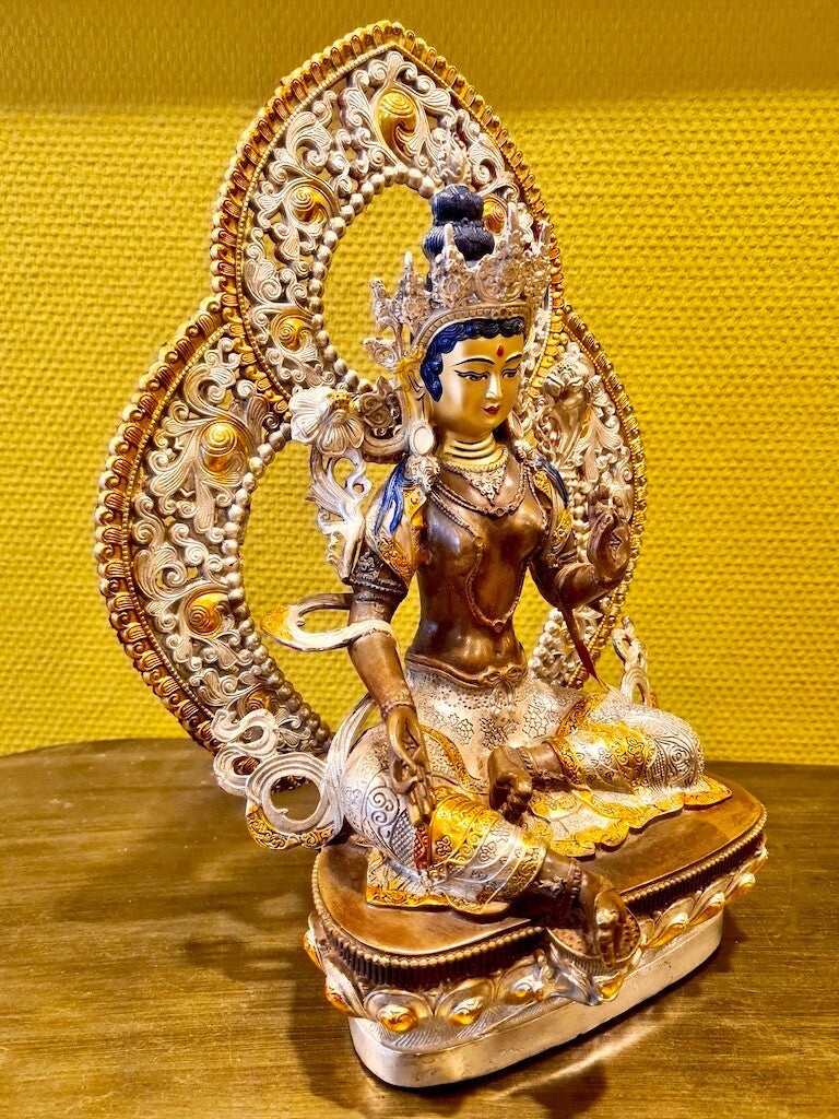 Links en rechts voorzien van twee lotusbloemen. Ze is rijkelijk voorzien van sieraden en vele bijzondere details. Haar uitgestoken rechtervoet is haar bereidheid om direct te kunnen handelen ter verzachting van het lijden van de mensheid. Tara zit op een prachtige lotus.