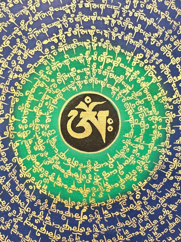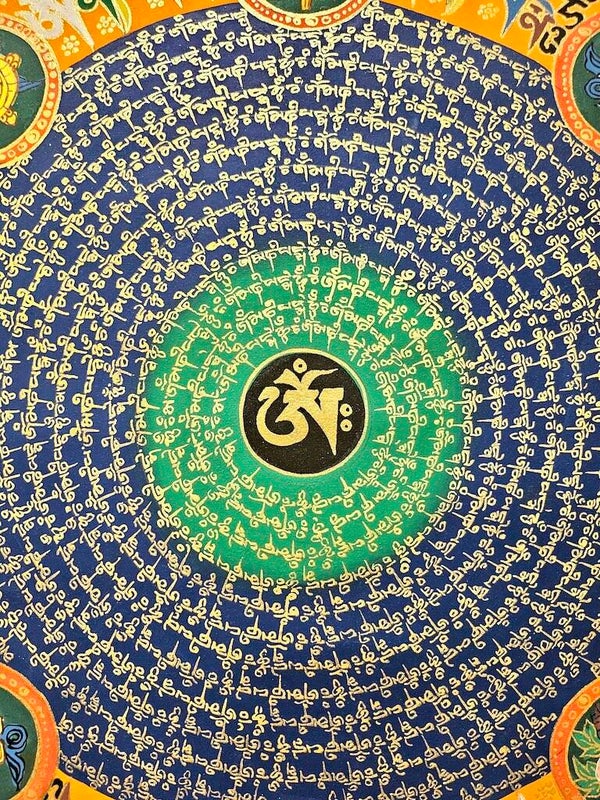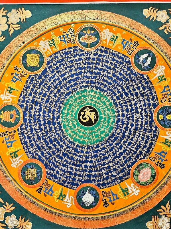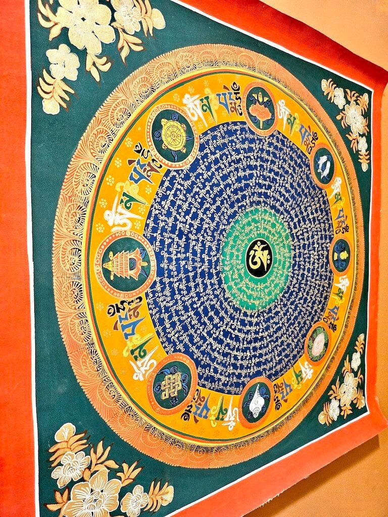 Origineel doek Aum Mhane Pemhe Hun Mantra Mandala met 8 gelukssymbolen!