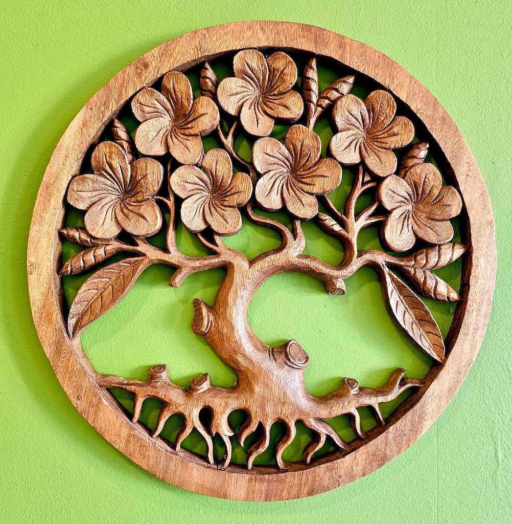 Dit decoratieve houten paneel met de zichtbare bloemen van de Frangipani (plumeria) is met de hand gesneden uit 100% duurzaam Suar-hout door Indonesische ambachtslieden.