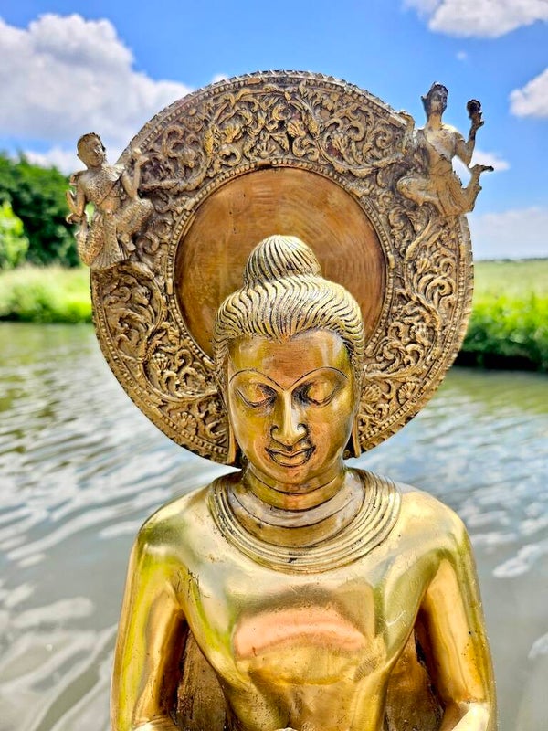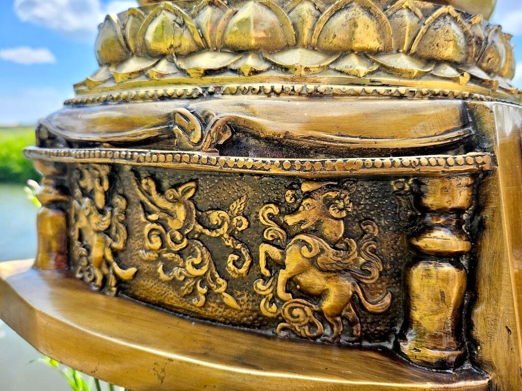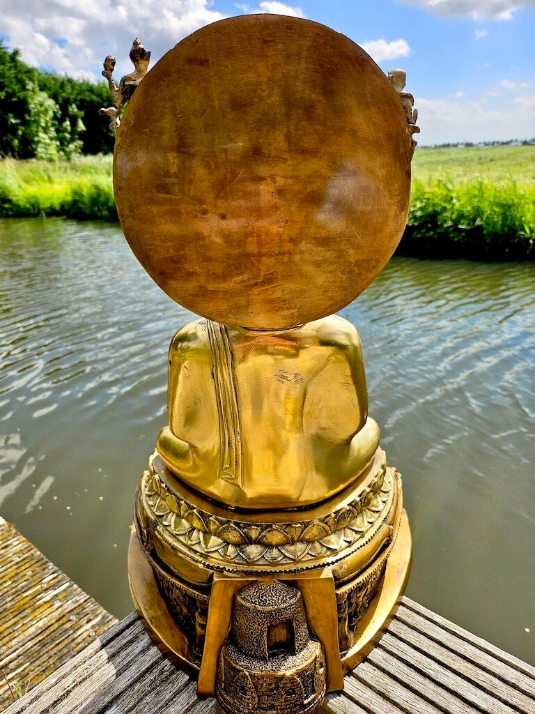 Een prachtig exclusief gedetailleerd bronzen beeld van Boeddha op dubbele lotus en altaar. Een sereen gezicht en afbeeldingen van onder andere zijn discipelen.