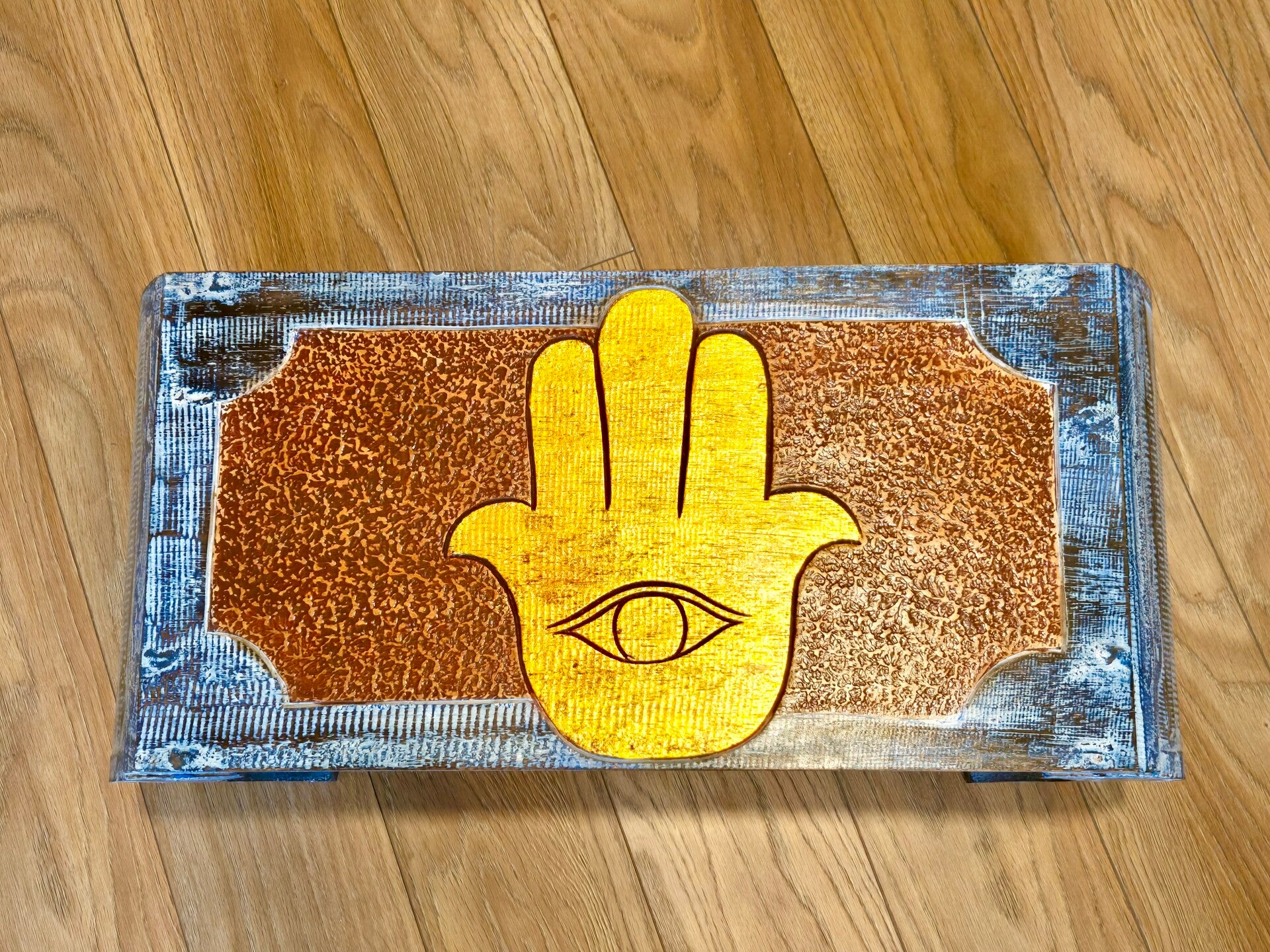 Warme kleuren in blauwe basis. Weergegeven is de hand van Fatima (Hamsa). De Hand van Fatima, ook wel de Khamsa of Hamsa genoemd, is een symbool dat vaak wordt geassocieerd met bescherming tegen het kwaad en negatieve invloeden. Het wordt vaak gebruikt in de islamitische cultuur, maar ook in andere culturen in Noord-Afrika en het Midden-Oosten. Het symbool wordt vaak afgebeeld als een hand met vijf uitgestrekte vingers, soms met een oog in het midden van de hand, wat staat voor bescherming tegen het "boze oog". Het wordt ook geassocieerd met kracht, zegeningen en geluk.