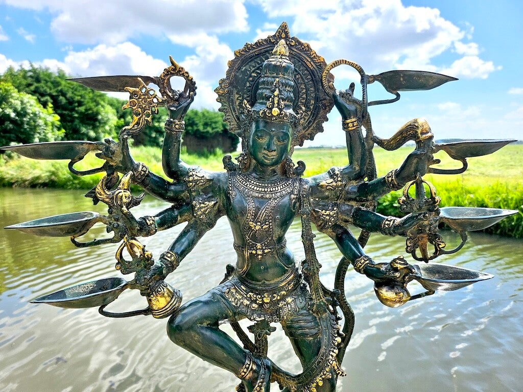 In zijn acht handen houdt hij naast zes kandelaren of schalen (niet bedoeld voor waxinelichtjes) bijvoorbeeld een waterketel of waterpot (Kamandalu) vast. Het symboliseert het vasthouden en dragen van ieders levenselixir.