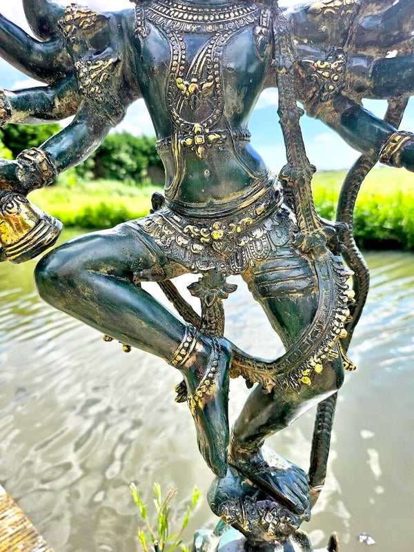 Shiva heeft een warme en open glimlach met een mooie goddelijke halo achter zijn hoofd. Shiva heeft een brons messing basis en bijzondere donkergroene patina. Zijn rechterbeen is verhoogd door zijn dans dat de sculptuur een verfijnde uitstraling geeft. Een prachtige voorstelling van Lord Shiva wat ons betreft!