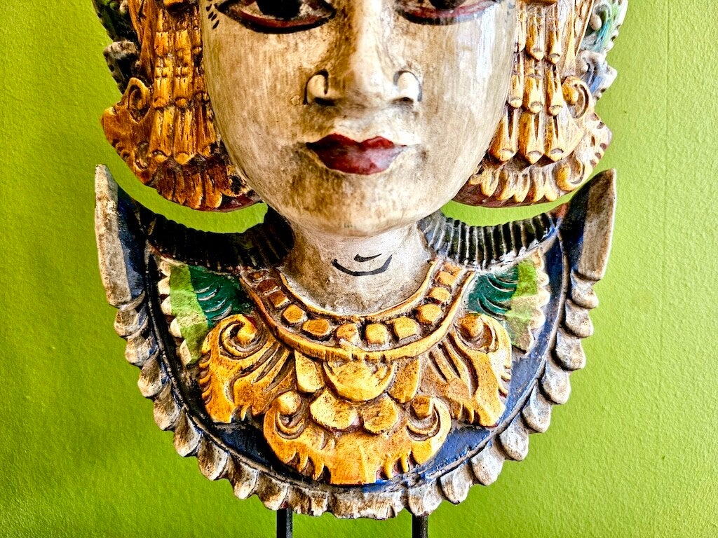 Balinese Stijl Dewi Sita Godin Buste sculptuur is prachtig met de hand gesneden uit albesia hout, een duurzame snelgroeiende houtsoort en fijn beschilderd in Balinese traditionele stijl met polychrome tinten door een familie van getalenteerde Balinese houtsnijders en kunstenaars uit het Ubud gebied.