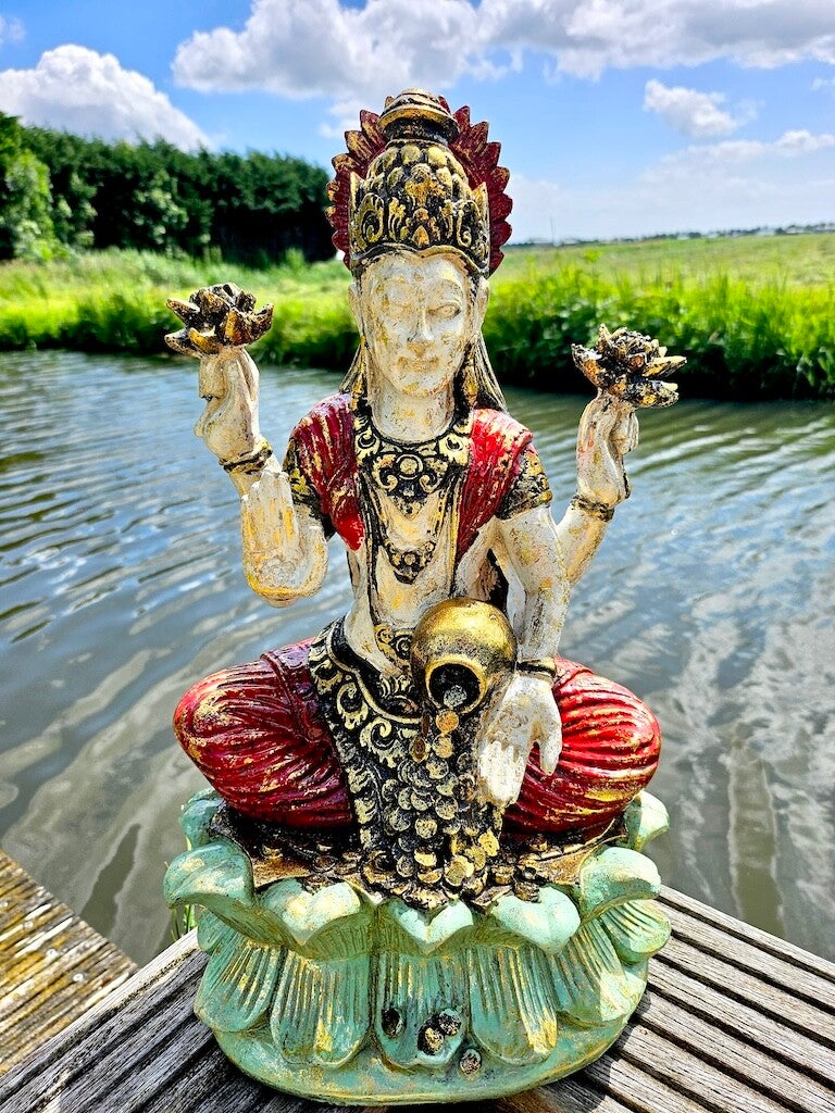 Je ziet ze vrijwel nooit, Lakshmi beelden in oldlook hout en ook nog eens met volle kleuren!