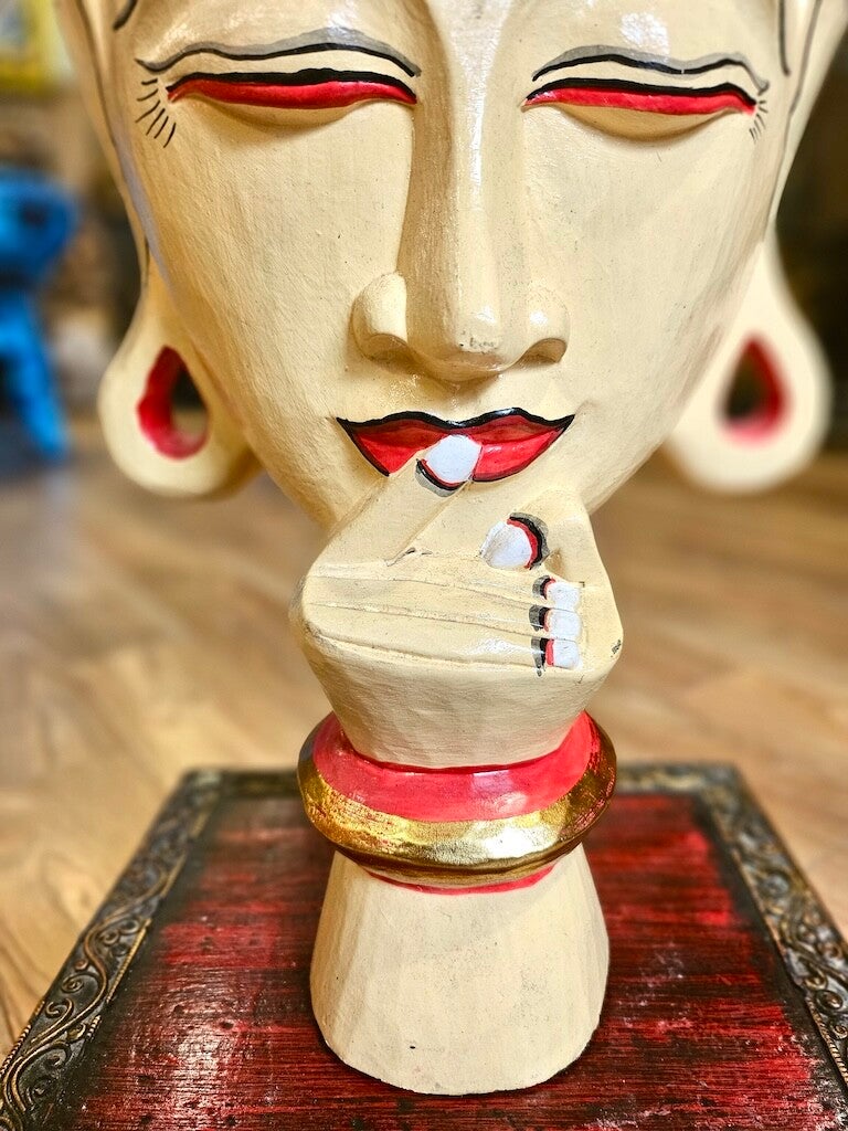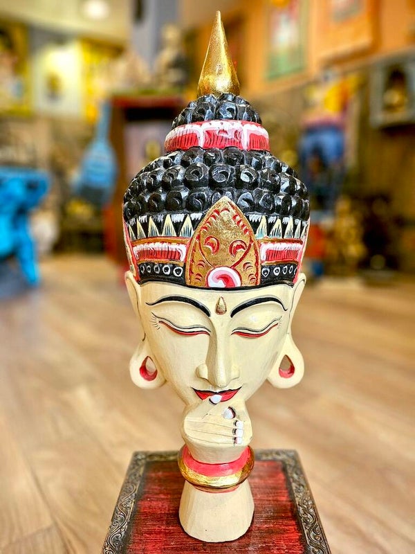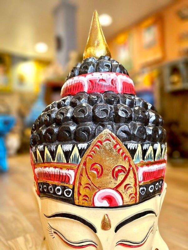 Dit bijzondere houten Thaise Boeddha hoofd is in een staat van meditatie. Diep in zichzelf verzonken en rustend in zijn hand.