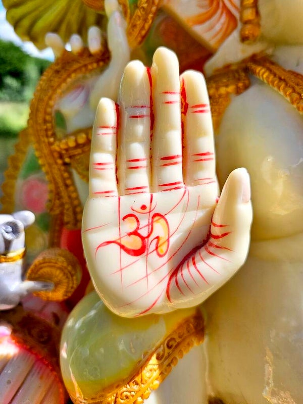 De omhoogstaande hand staat voor het geven van zegen. Ganesha geeft de toegewijden van het Goddelijke zijn zegen. Door ware toewijding zijn we in staat de zegen van het Goddelijke te ontvangen en door deze zegen kunnen wij tot het Goddelijke komen wanneer wij ons leven daarop inrichten.