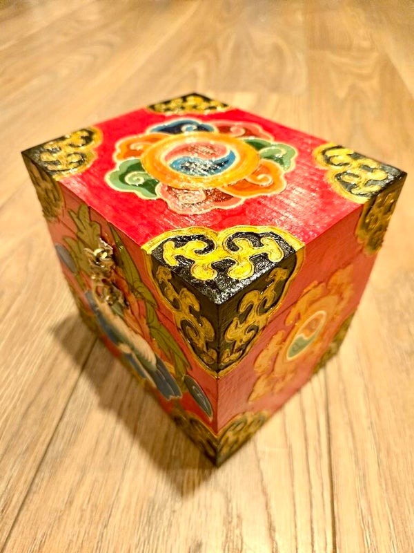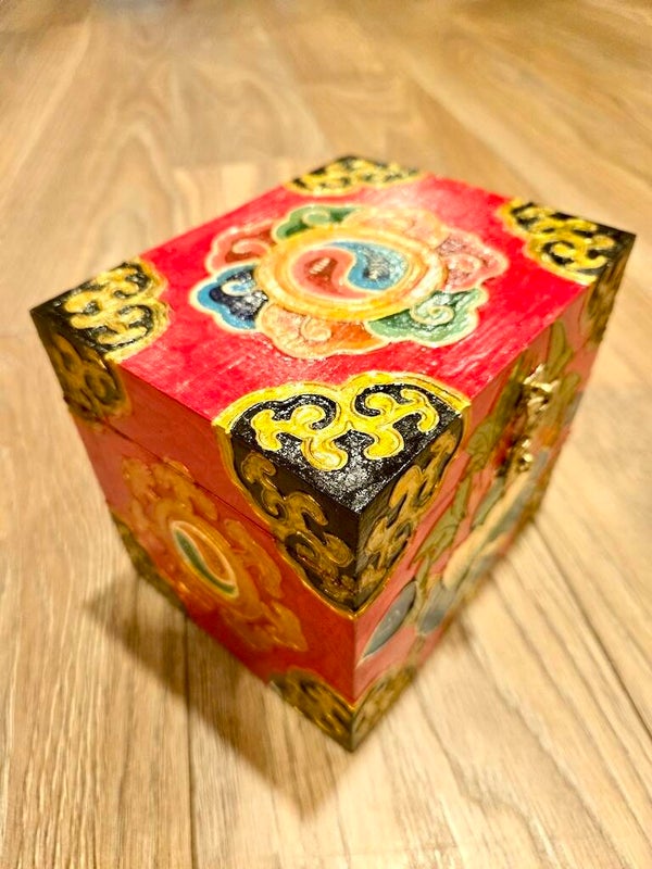 Dit volledig handgemaakte unieke kistje uit Tibet is echt vrolijk gekleurd en natuurlijk ook handig om allerlei zaken in op te bergen zoals sieraden! Tevens is het als accessoire in huis werkelijk een mooie aanvulling. Op de bovenkant een gekleurd yin-yang symbool.