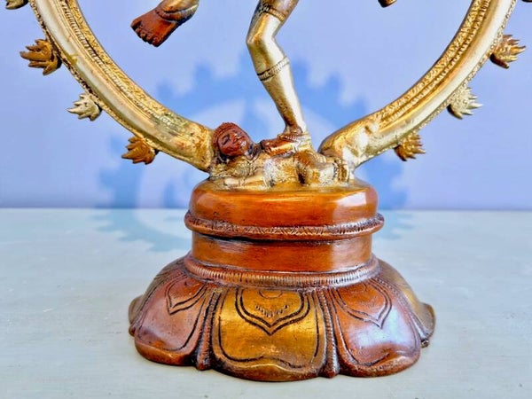 Shiva Nataraja's vier armen zijn niet alleen een kenmerk van Indische goden, maar symboliseren ook de almacht van Shiva. Onder zijn rechtervoet trapt hij de demon Apasmara-Purusha, een figuur die de onwetende ziel representeert. Dit geeft de overwinning van het goddelijke op onwetendheid en illusie aan, wat essentieel is voor de spirituele bevrijding.