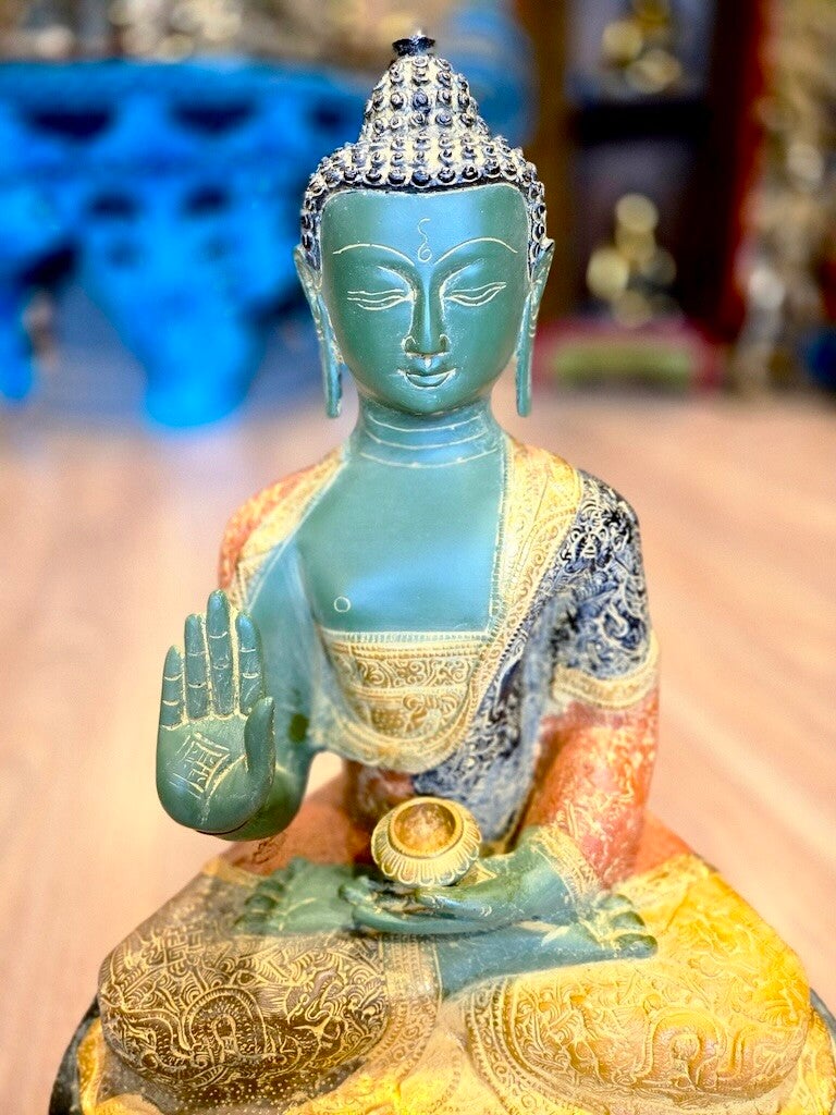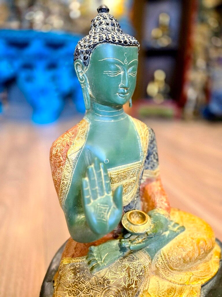 Wat een bijzondere warme kleuren en magnifieke details! We zijn zelf onder de indruk van dit kunstwerk. Gegoten door een van de beste bronsgieters en afgewerkt door ambachtslieden in Delhi. Exclusief bij Boeddha Centre!