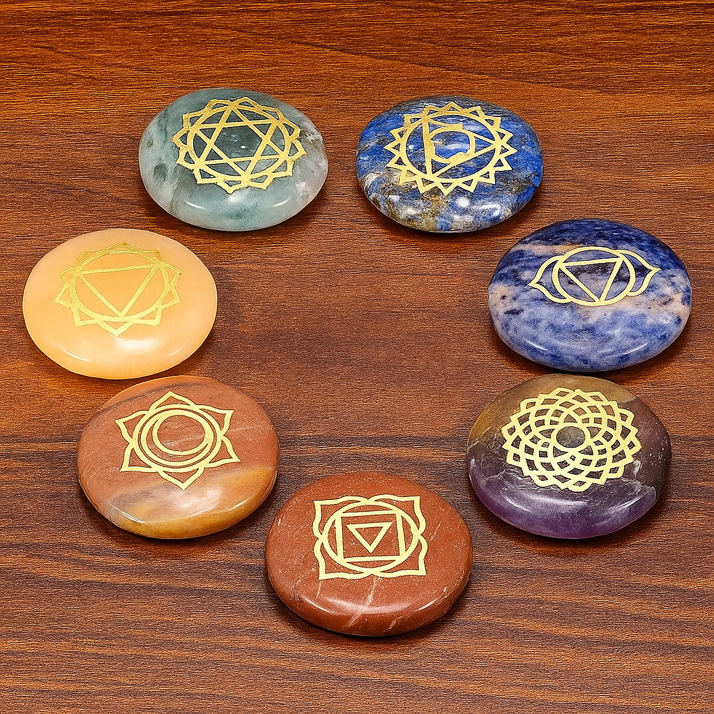 Een prachtige set van zeven ronde, platte edelstenen in diverse kleuren. Op iedere steen is in goud een symbool van één van de zeven chakra’s gegraveerd.