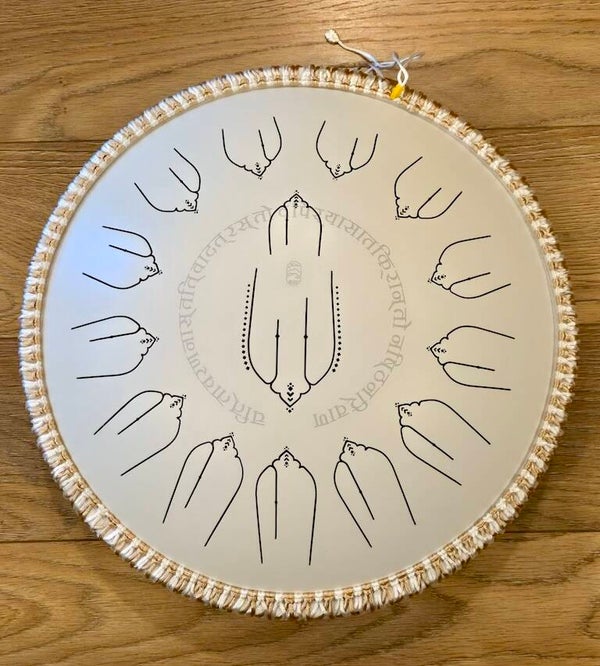 Deze unieke drum combineert de eigenschappen van zowel een handpan als een tongue drum. Het speeloppervlak is vervaardigd uit titaniumstaal, helder wit afgewerkt en voorzien van een gestileerd motief uit de Hartsoetra. De basis is gemaakt van diep groen berkenhout, wat zorgt voor een warme resonantie. Dankzij dit hybride ontwerp komt de melodische helderheid van een tongue drum samen met de diepe projectie van een handpan. Door de houten stop aan de onderzijde te verwijderen, worden de boventonen extra benadrukt.