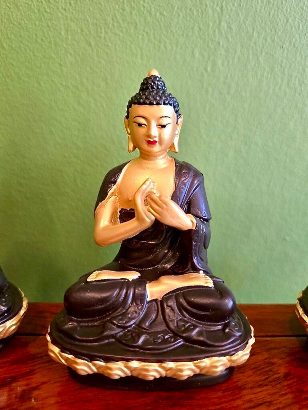Mudra: Bhumisparsha mudra (aarde-aanraak-gebaar: rechterhand raakt de aarde, zoals bij jouw tweede van links).