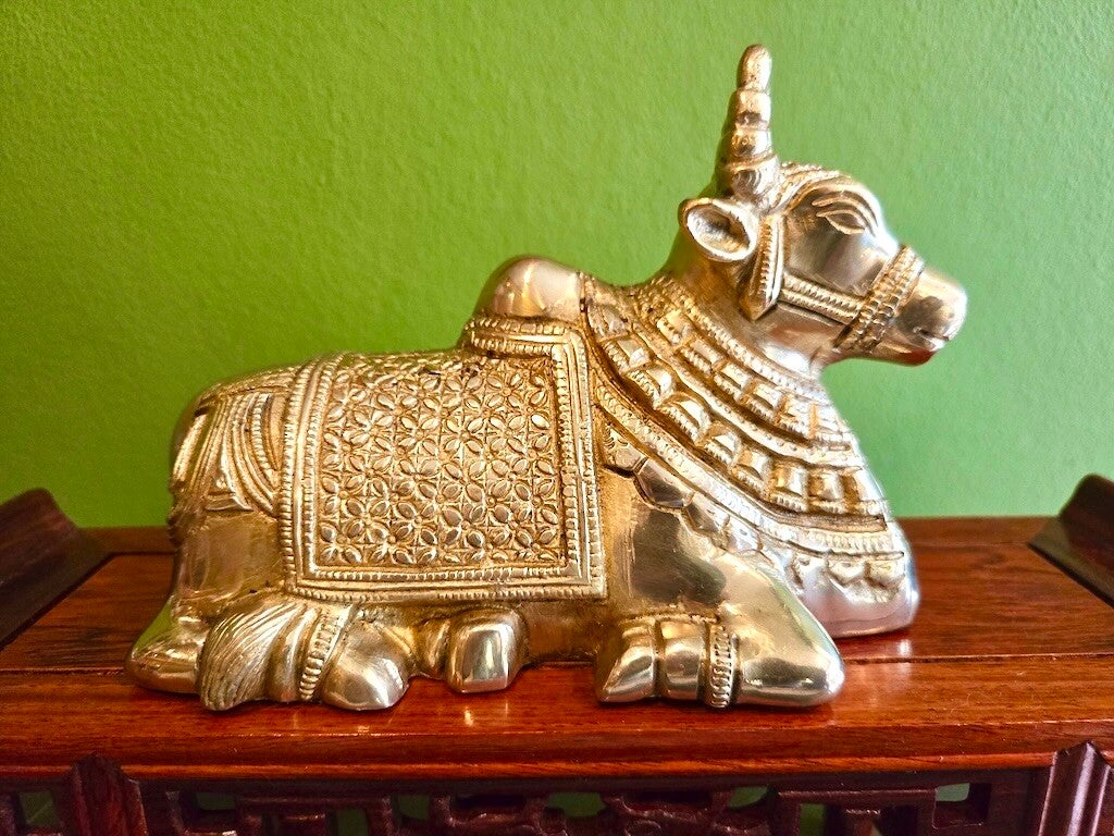 Het beeld is rijk gedetailleerd met sierlijke patronen op het zadel en halsornamenten, wat het een luxe en ambachtelijke uitstraling geeft. De goudachtige afwerking versterkt het gevoel van zuiverheid en verhevenheid dat met Nandi wordt geassocieerd.