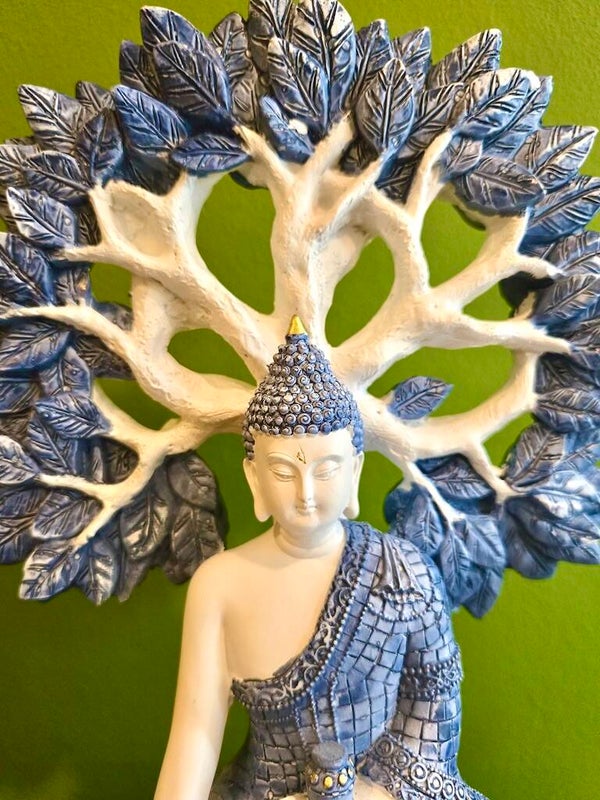 Dit beeld toont een mooie boeddhistische figuur met een artistieke weergave van de Bodhiboom (of Boeddhaboom) achter de Boeddha. De boeddha is gekleed in een traditionele boeddhistische monnikstuik, met gedetailleerde patronen die de spirituele rust en het inzicht symboliseren. De blauwe en witte kleuren creëren een kalme en serene uitstraling, perfect voor een meditatieve ruimte of spirituele omgeving. De bladeren die uit de boom groeien, vertegenwoordigen veelal wijsheid, verlichting en groei, die symbool staan voor de spirituele reis die Boeddha ondernam om verlichting te bereiken.