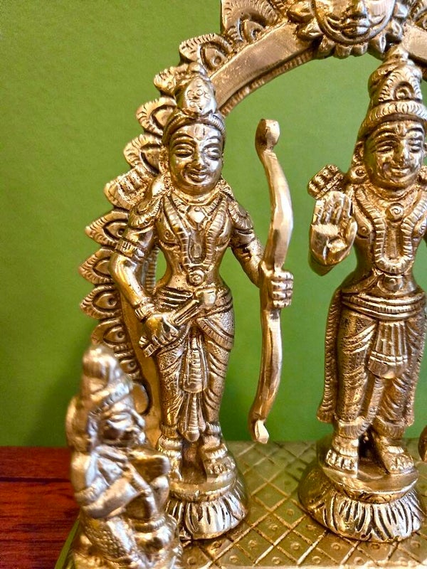 Dit is een beeld van Ram Darbar, een belangrijke voorstelling uit het Hindoeïsme. De Ram Darbar toont Lord Ram, zijn vrouw Sita, zijn broer Lakshman, en zijn toewijde dienaar Hanuman. Dit beeld is vaak te vinden in hindoeïstische huizen en tempels als een symbolisch object van devotie en vroomheid. Het wordt vaak gebruikt voor aanbidding en als teken van kracht, gerechtigheid en deugd.