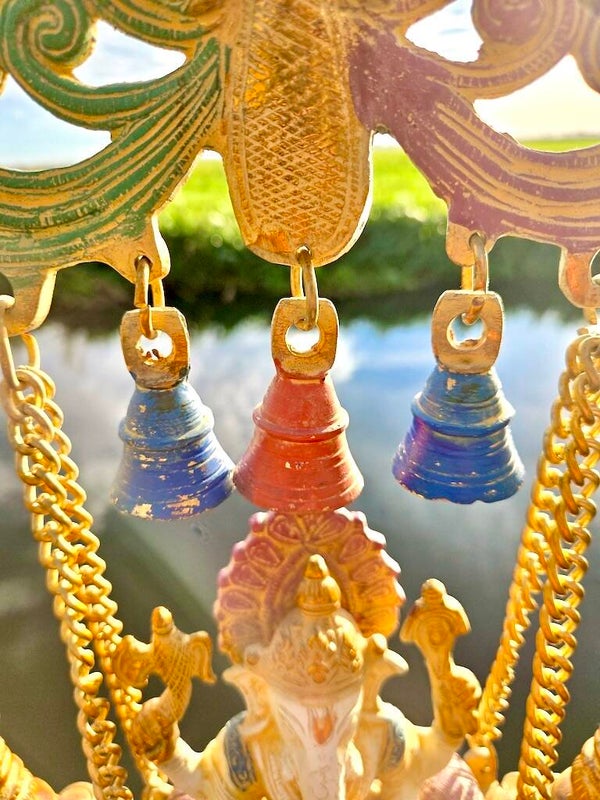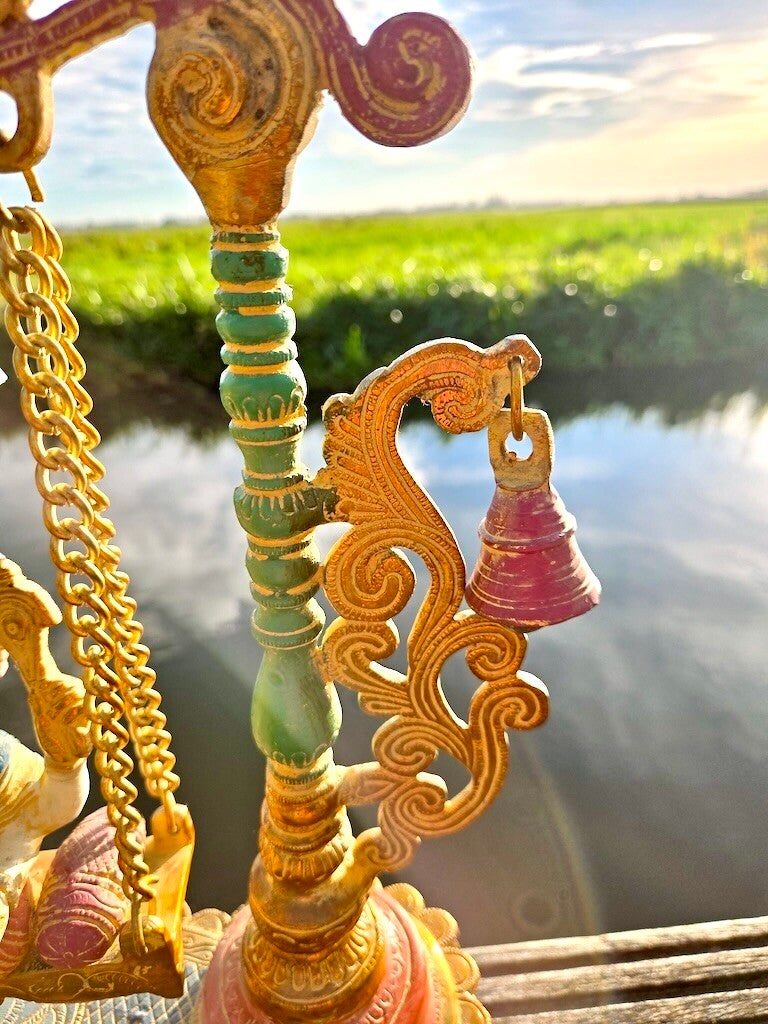 Dit bijzondere bronzen beeld in True Nature stijl toont Ganesha, de geliefde hindoegod van wijsheid, voorspoed en nieuwe beginnen, zittend op een rijk gedecoreerde schommel (jhula). Deze combinatie is traditioneel in India en staat symbool voor vreugde, beweging, harmonie en het uitnodigen van positieve energie.