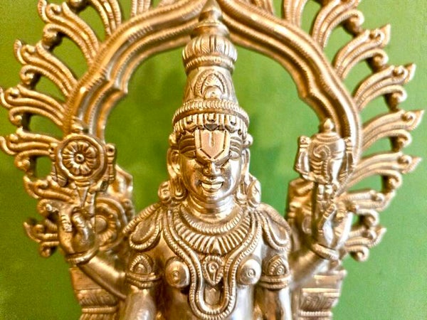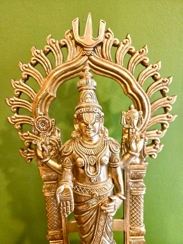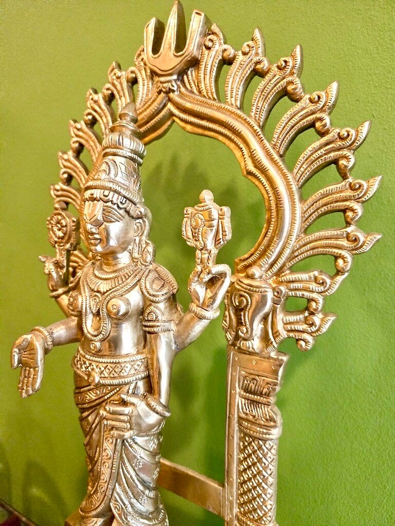 Het sierlijke aureool, de prabha mandala, vormt een stralende omlijsting die zijn goddelijke energie benadrukt. Daaronder rust hij op een voetstuk in de vorm van een schildpad, dat verwijst naar Vishnu’s Kurma avatar. Dit motief staat voor stabiliteit, ondersteuning en het vermogen om lasten te dragen. Samen zorgt dit voor een harmonieuze compositie die zowel spiritueel betekenisvol als esthetisch verfijnd is.