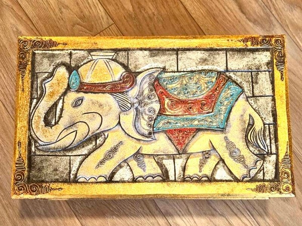 Deze sfeervolle houten sierkist is een prachtig voorbeeld van traditioneel handwerk dat direct warmte en karakter toevoegt aan elke ruimte. Het deksel is rijk gedecoreerd met een sierlijke olifant, een symbool dat in verschillende Aziatische culturen staat voor voorspoed, wijsheid en bescherming. De combinatie van goudtinten, uitgesneden details en handgeschilderde accenten geeft de kist een authentieke, bijna koninklijke uitstraling.