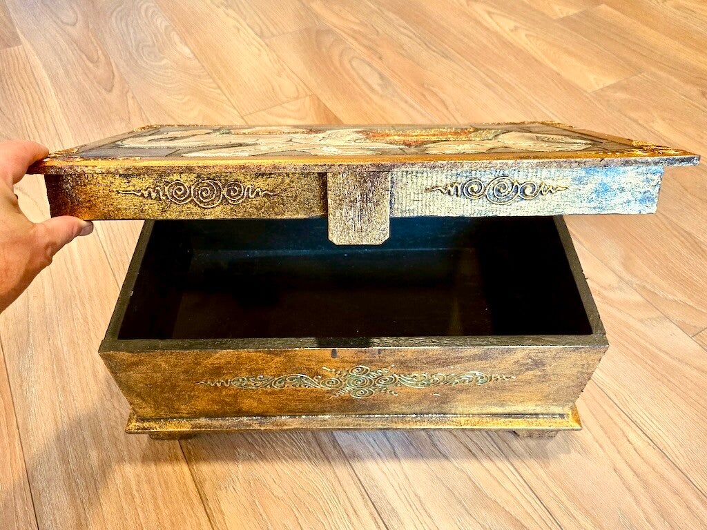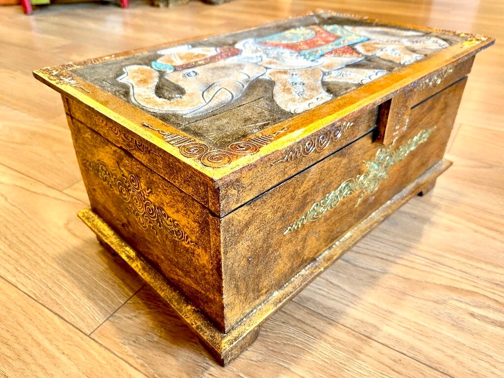 Deze kist is afkomstig uit India waar traditioneel houtambacht en decoratief schilderwerk sterk aanwezig zijn. De stijlkenmerken, de goudpatina, de gedecoreerde olifant, de combinatie van houtsnijwerk en verf, zijn typisch voor ambachtelijke werkplaatsen in India. Met name Rajasthan en Gujarat. In deze regio’s is het gebruikelijk om houten dozen te versieren met symbolische dierenmotieven, rijke kleuren en ornamentale randen, precies zoals je ziet op deze prachtige kist.