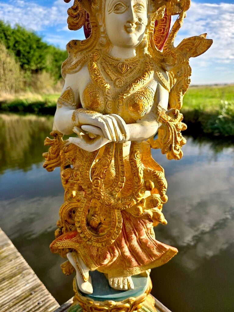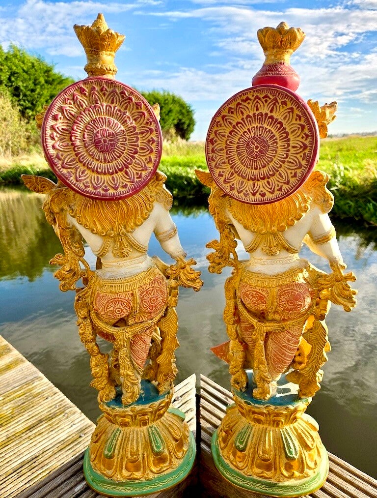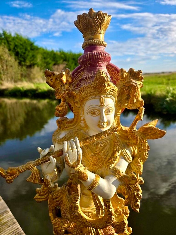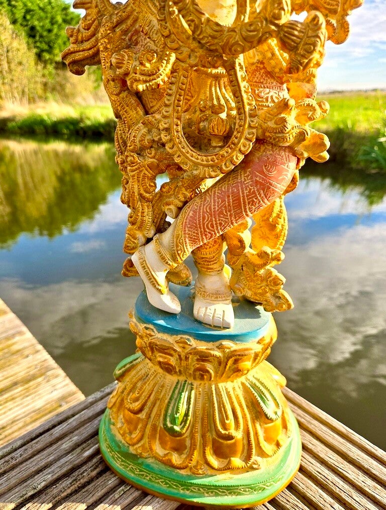 Een beeld van Radha en Krishna symboliseert de diepe spirituele liefde en eenheid tussen de goddelijke vrouwelijk en mannelijk principe. Krishna, de incarnatie van het goddelijke, wordt vaak afgebeeld met zijn geliefde Radha, die de essentie van devotie en liefde vertegenwoordigt. Radha is de ultieme aanbidder van Krishna, en hun relatie wordt gezien als een metafoor voor de ziel die zich verenigt met het goddelijke. Dit beeld staat voor liefde, harmonie, devotie, en de zoektocht naar spirituele verlichting door pure toewijding aan het goddelijke. Het benadrukt ook het belang van onvoorwaardelijke liefde en verbondenheid in de spirituele reis.