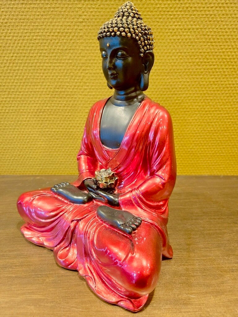 Dit beeld toont een prachtige Buddha in een meditatieve zithouding. Het is gekleed in een felrode toga die elegant over zijn benen valt, wat contrasteert met de zwarte afwerking van zijn gezicht, handen en voeten. Dit type beeld is typisch voor Boeddhistische kunst en symboliseert de staat van verlichting en innerlijke rust.