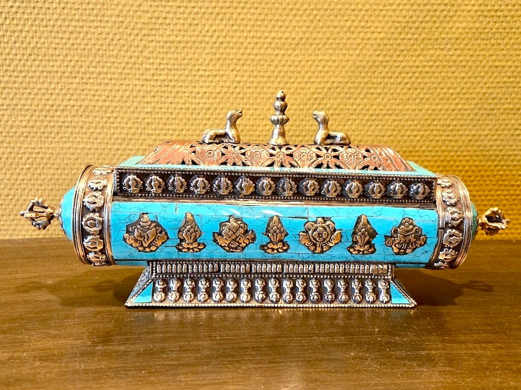De wierookbrander is afkomstig uit Tibet en wordt bovenop voorzien van twee Tibetan snow lions. Deze sneeuw leeuwen staan voor "good luck and fortune".
