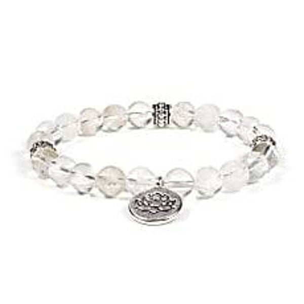 Elastische mala-armband met 21 kralen van bergkristal en een decoratieve bedel met lotus symbool. De heldere, transparante kralen geven de armband een tijdloze en verfijnde uitstraling. Door het elastische ontwerp is de armband comfortabel te dragen en geschikt voor vrijwel iedere vrouwenpols.
