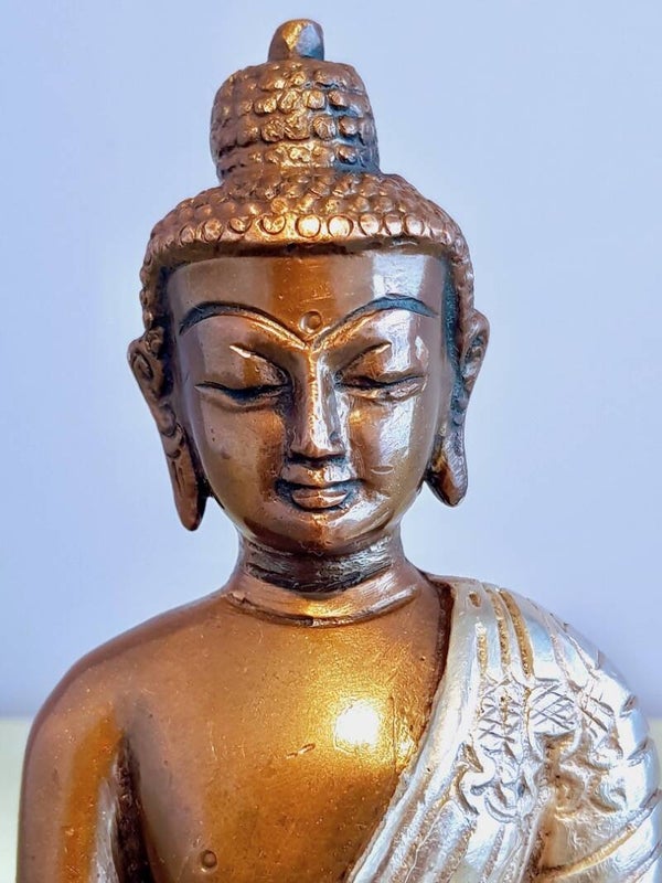 De houding van zijn rechterhand, met zijn vingertoppen de aarde aanrakend, heet 'bhumisparshamudra'.