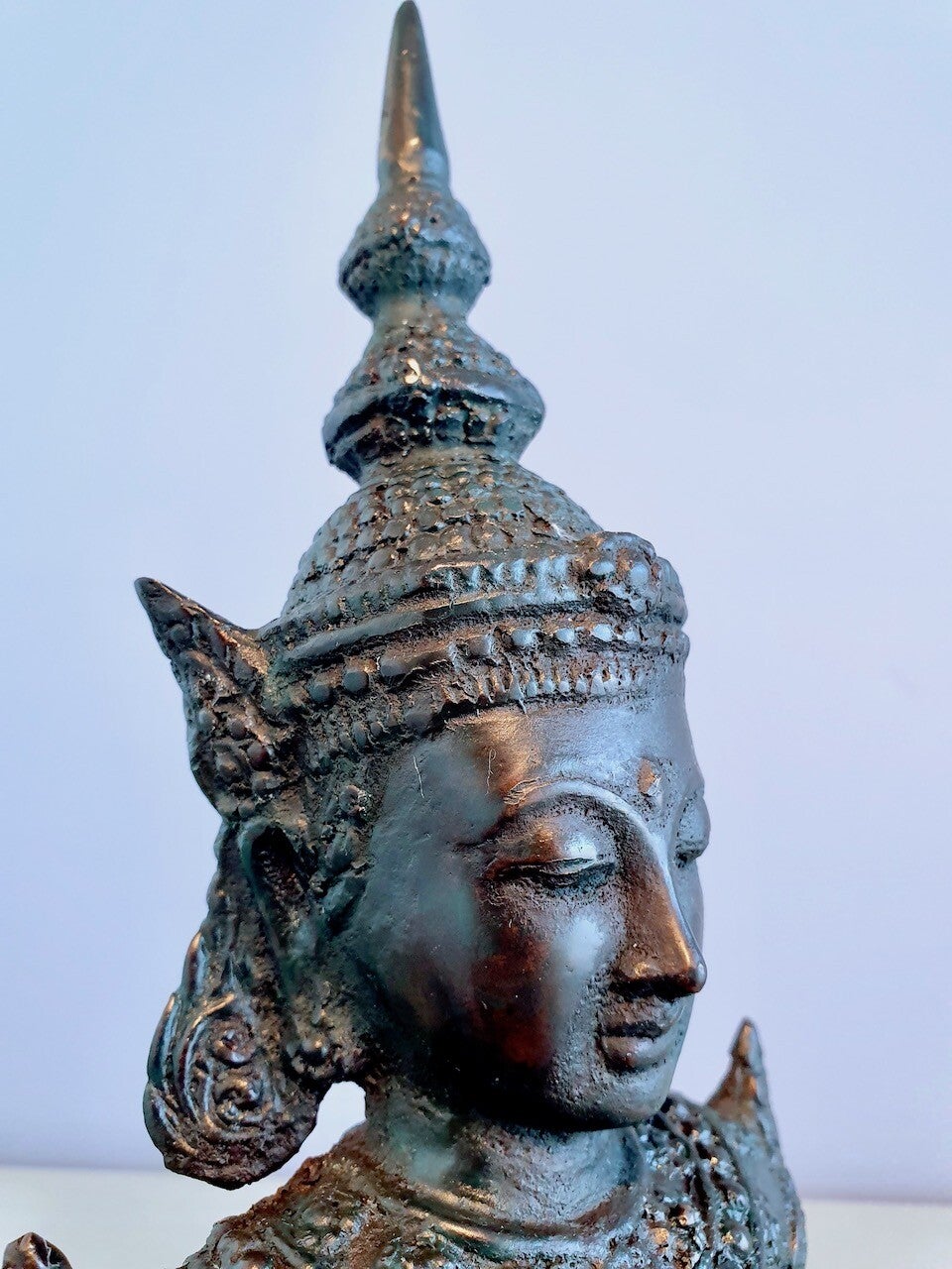 De late Ayutthaya periode: In de latere periode werd het maken van bronzen Boeddha beelden in koninklijke kleding erg populair. Twee verschillende stijlen werden geleidelijk zichtbaar; een Boeddha in overvloedig versierde keizerskleding en een meer gematigde versie met een kroon of diadeem met flenzen die de beide oren bedekten. Het werd allemaal ook meer decoratiever voor de zittende Boeddha beelden zoals dit exemplaar betreft.