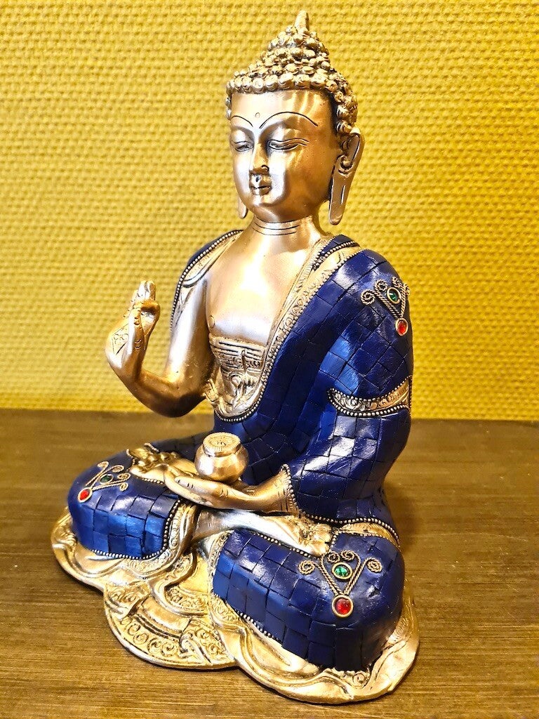 Een prachtig blauw handgemaakt bronzen boeddha beeld uit india. Boeddha wordt hier weergegeven als onderwijzer met zijn hand in de vitarka mudra. Het gebaar dat boeddha bij zijn leerredes en discussies gebruikte om zijn woorden kracht bij te zetten.