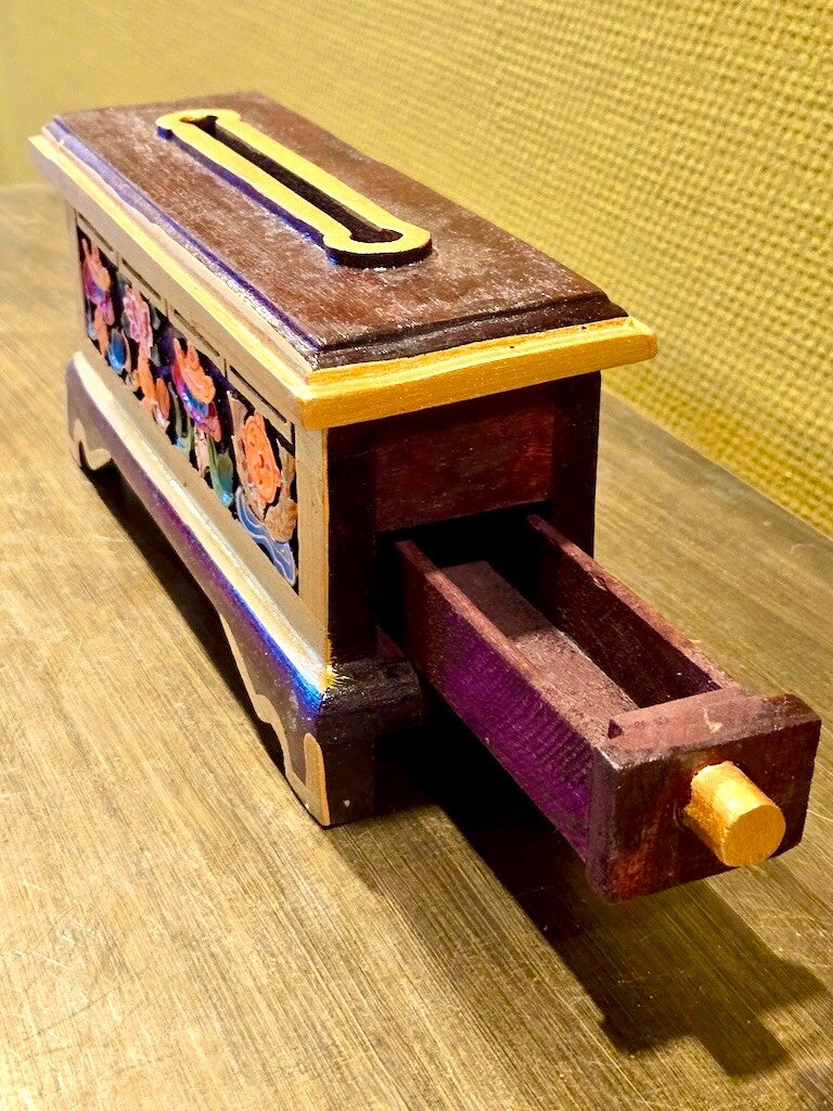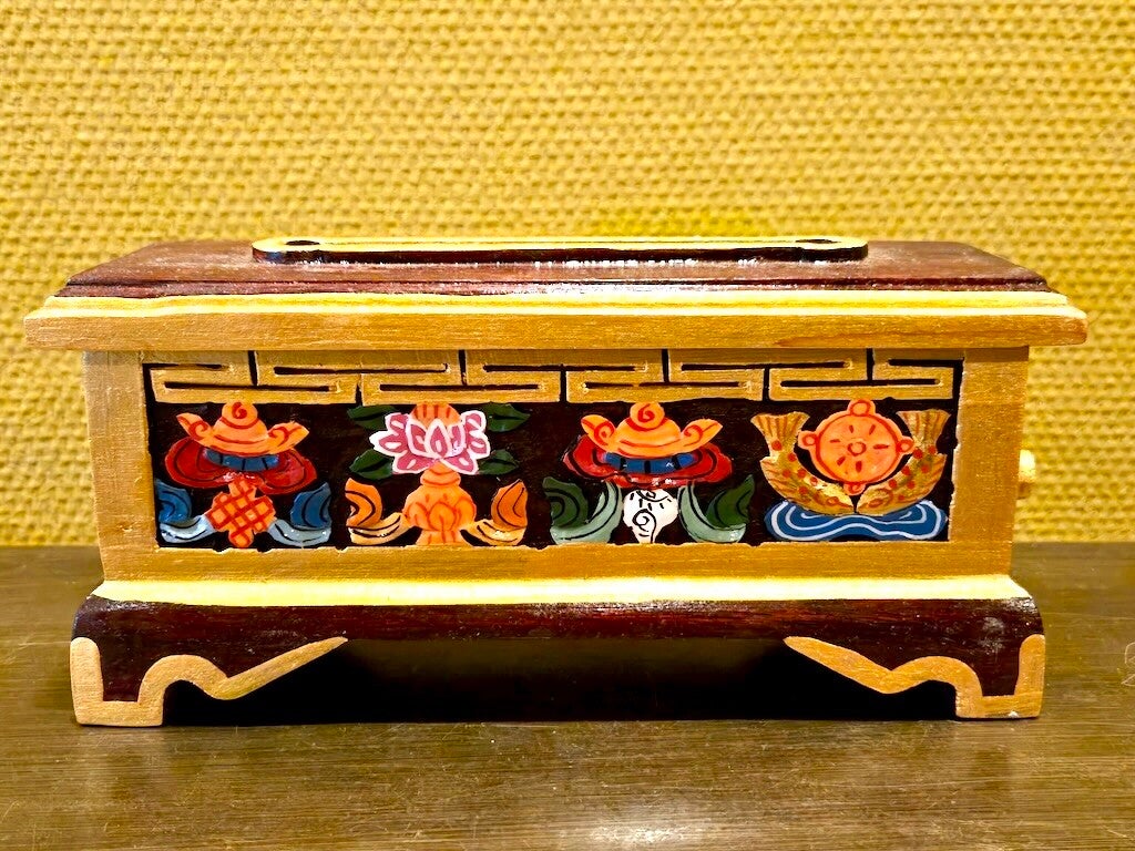 Materiaal: Hout en een metalen bakje waarachter het wierookstokje kan worden geklemd. Alleen voor stokjes met hout. Handwerk en handgeschilderd! Aan de zijkant een handig bakje waar je wierook in kunt bewaren.