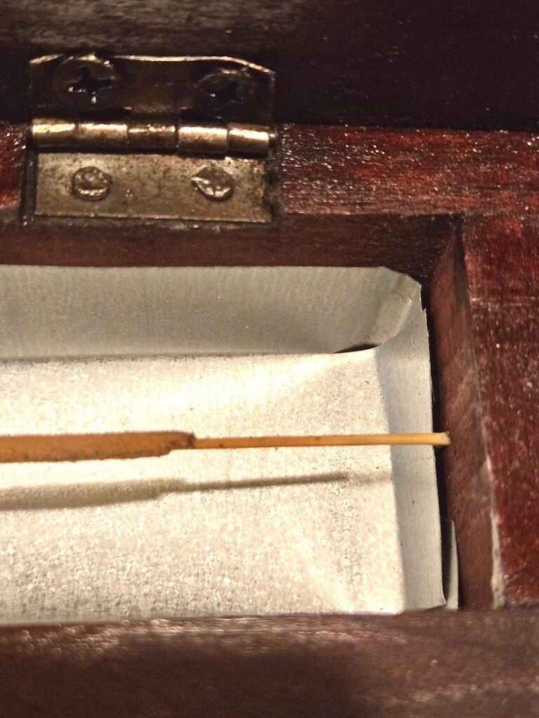 Wij laten het wierookstokje echter wel helemaal opbranden. Dat doen we door het stokje aan de zijkant tussen het plaatje te steken en langzaam het stokje te buigen tot het breekt en exact in het midden blijft hangen (zie de laatste foto). Zo kun je zelf bepalen hoe je het wil branden.