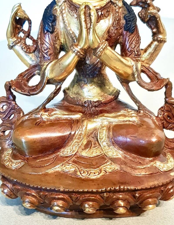 Lang geleden nam Chenrezig de gelofte niet terug te keren naar Nirvana totdat alle levende wezens zouden zijn bevrijd van lijden. In deze 4-armige vorm, gezeten in volledige lotuspositie, vertegenwoordigt hij de Vier Onmetelijke Kwaliteiten van een Bodhisattva: liefde, mededogen, vreugde en gelijkmoedigheid.