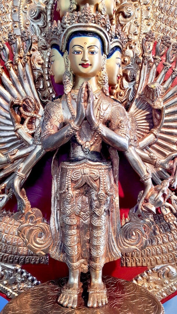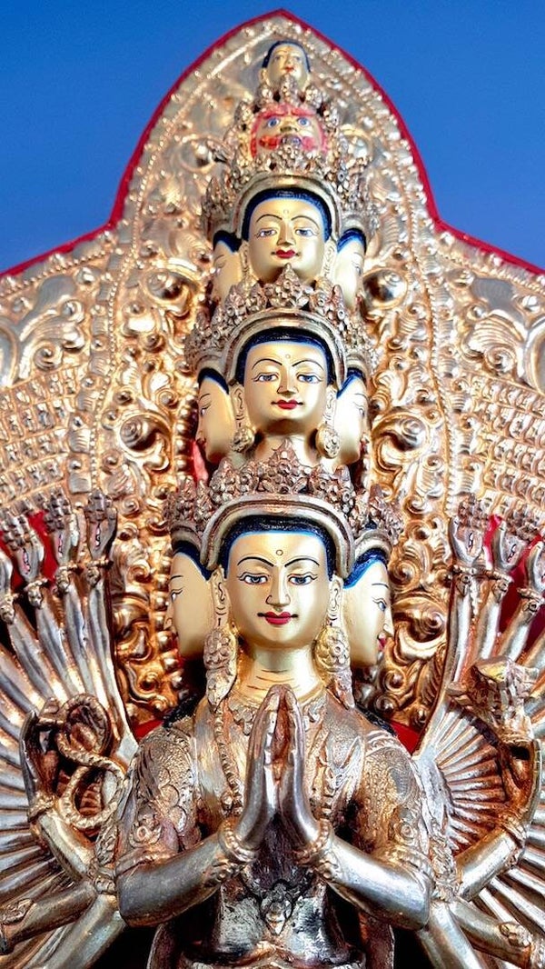 Zijn 1000 duizend gewapende vorm heeft elf hoofden met drie niveaus afnemend in grootte met zijn gezicht naar buiten aan beide zijden. Het vertegenwoordigt zijn aldoordringende blik. Het is het toornige hoofd van de Bodhisattva of Power, Vajrapani, waarvan de niet aflatende dynamische kracht en macht van Avalokitesvara in het voordeel van alle wezens helpt via de hoofden.