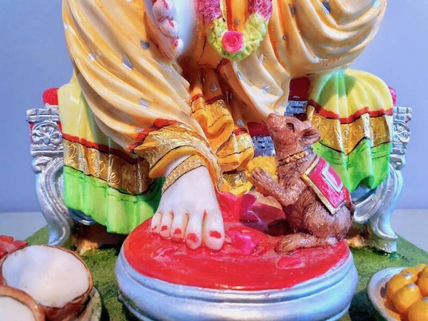 Een muis naast de voeten van Ganesha