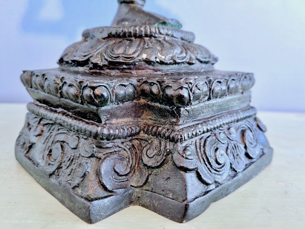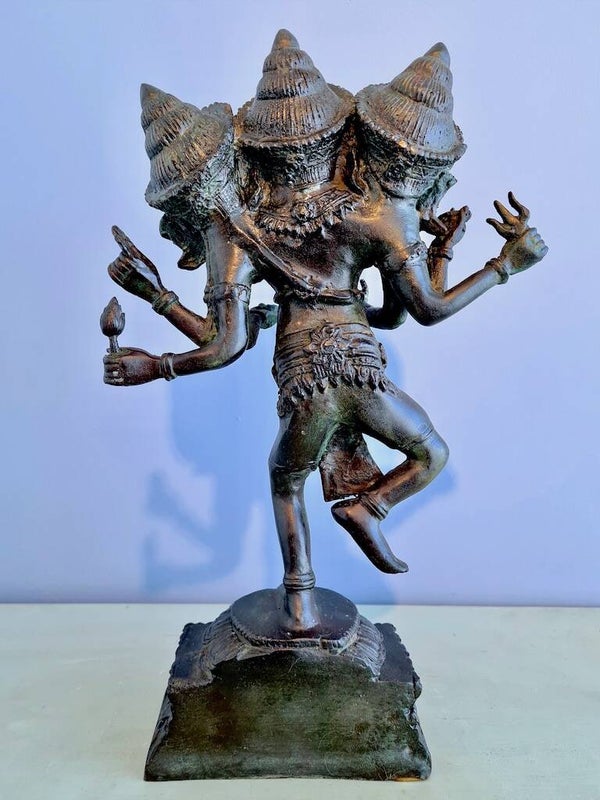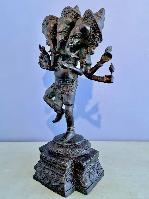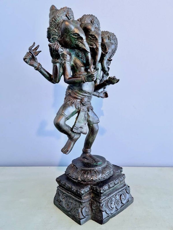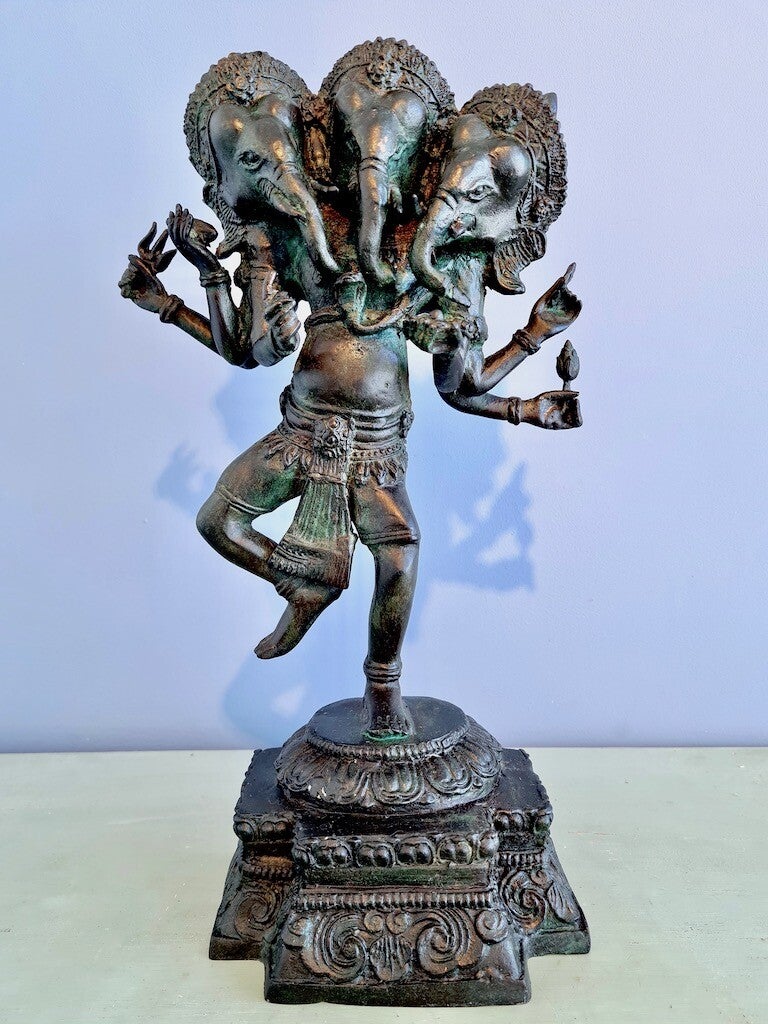 Er wordt aangenomen dat de geest altijd in Sattva is, en Rajas en Tamas zijn de twee storende elementen. Trimukhi is in bepaalde gebieden op de wereld de meest populaire vorm van Ganesha. Hier in deze vorm wordt de de olifanthoofdige heer in drie gezichten gepresenteerd en is donkergrijs zwart van kleur en heeft al de mooie oude karaktertrekken gekregen. Tevens her en der groene patina accenten.