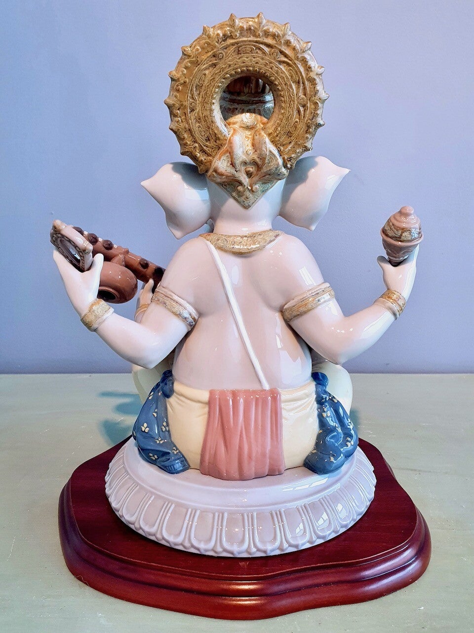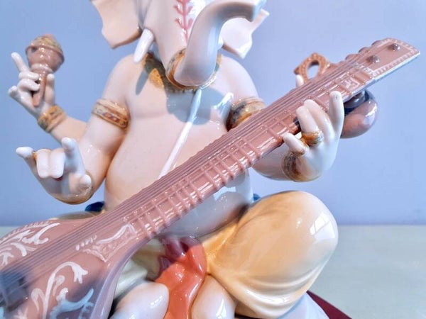 Deze Lord Ganesha heeft een grote indiaanse gitaar genaamd vina. Verder zit het stuk vol met andere attributen uit Ganesha's iconografie zoals de gada (of foelie), de paasha (strop of touw). Het touw of de lasso van de god staat symbool voor het controleren van de geest. Tevens is de gebroken slagtand ook in het beeld verwerkt. De afgebroken slagtand zegt dat we al het goede in ons moeten bewaren en afstand moeten nemen van het slechte. Het staat ook voor wijsheid en juiste omgang met emoties.