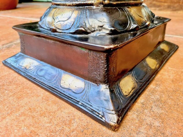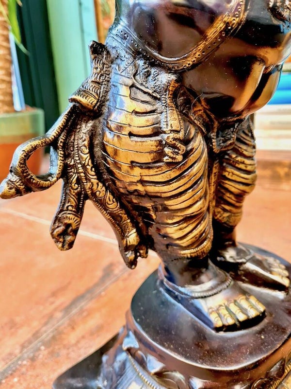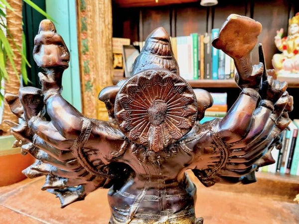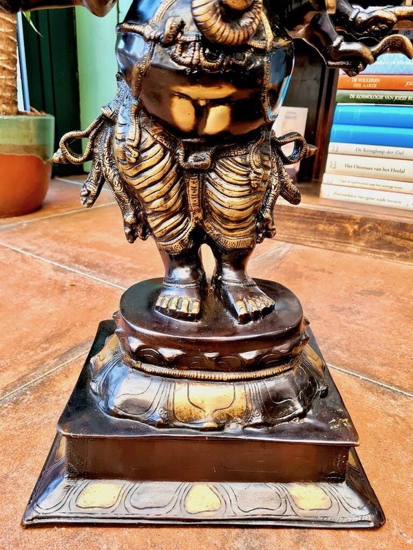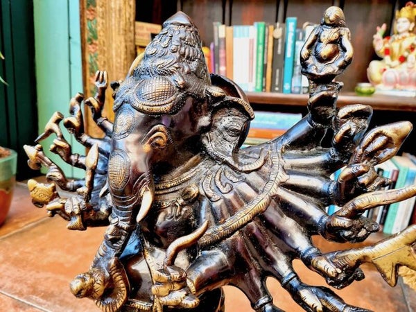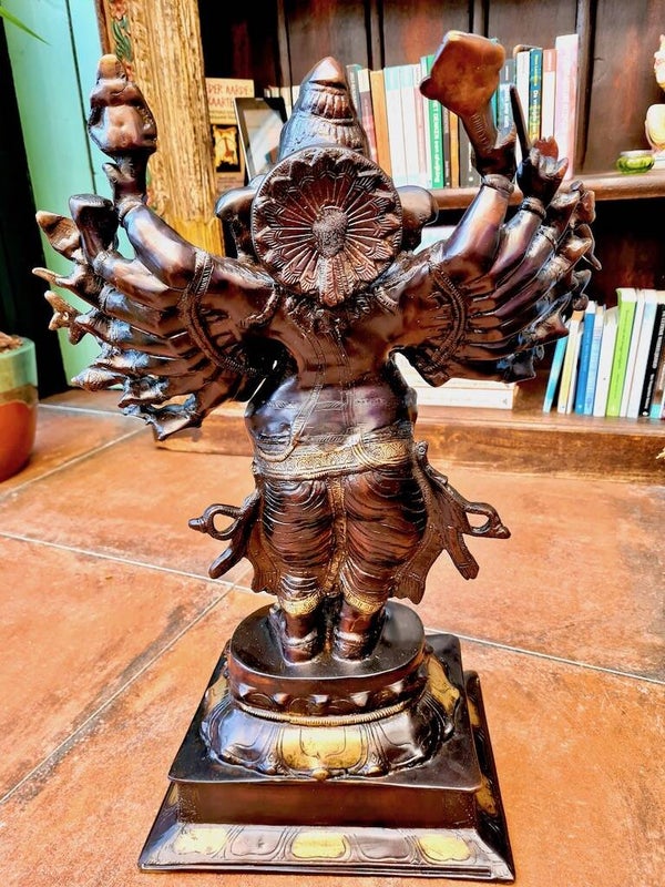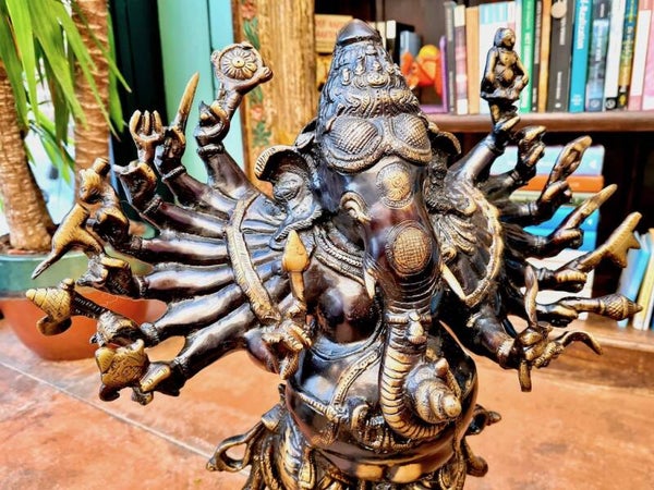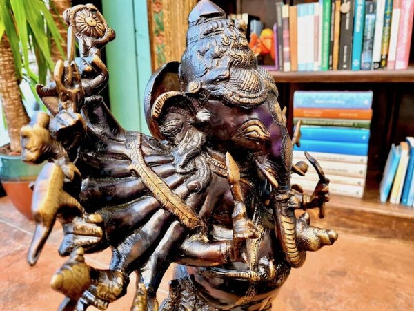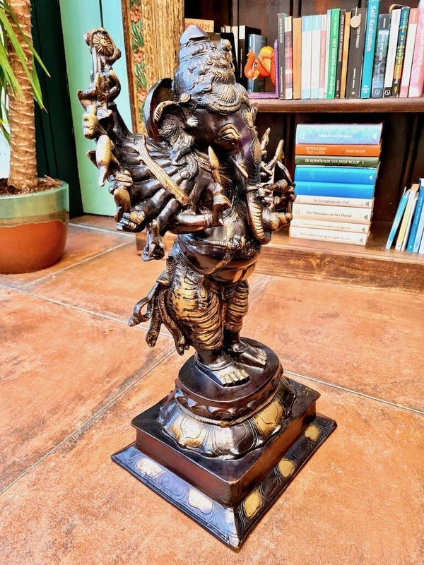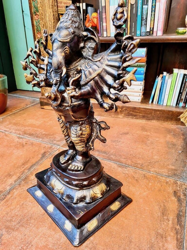 Dit bronzen beeld van Ganapati, groot van formaat maar ook onmetelijk in zijn grootsheid en grandeur, definieert zijn Vira Ganapati - de 'dappere krijger' vorm, een van zijn aanvankelijke vierendertig klassieke vormen die vroege teksten, de achtste eeuwse Maudgalya Purana in het bijzonder, hebben geïdentificeerd of opgevat. Hoewel uitzonderlijk mooi en begiftigd met een goddelijk aura, is Vira Ganapati, in de eerste plaats een votiefvorm die wordt opgevat als staand en gereed om naar een doel te gaan, in het algemeen een felle vorm met een bevelvoerende houding. In plasticiteit, precisie, kleinheid van details, vooral in het ontwerpen van zijn 'antariya' - de onderste kleding, en ornamenten en kroon, en in het creëren van het gewenste effect, vooral de majestueuze houding, is dit artefact gewoon ongeëvenaard. Met zestien armen aan beide zijden gestrekt krijgt het beeld een cirkelvorm en is daarmee suggestief voor de kosmische dimensies waarin Heer Ganesha doordringt.
