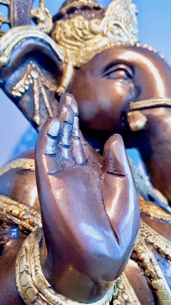De omhoogstaande hand staat voor het geven van zegen. Ganesha geeft de toegewijden van het Goddelijke zijn zegen. Door ware toewijding zijn we in staat de zegen van het Goddelijke te ontvangen en door deze zegen kunnen wij tot het Goddelijke komen wanneer wij ons leven daarop inrichten.