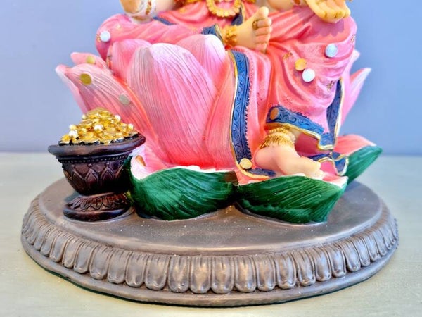 In tegenstelling tot Saraswati, is Lakshmi meestal afgebeeld met veel rijke sieraden, veel goud en veel geld.