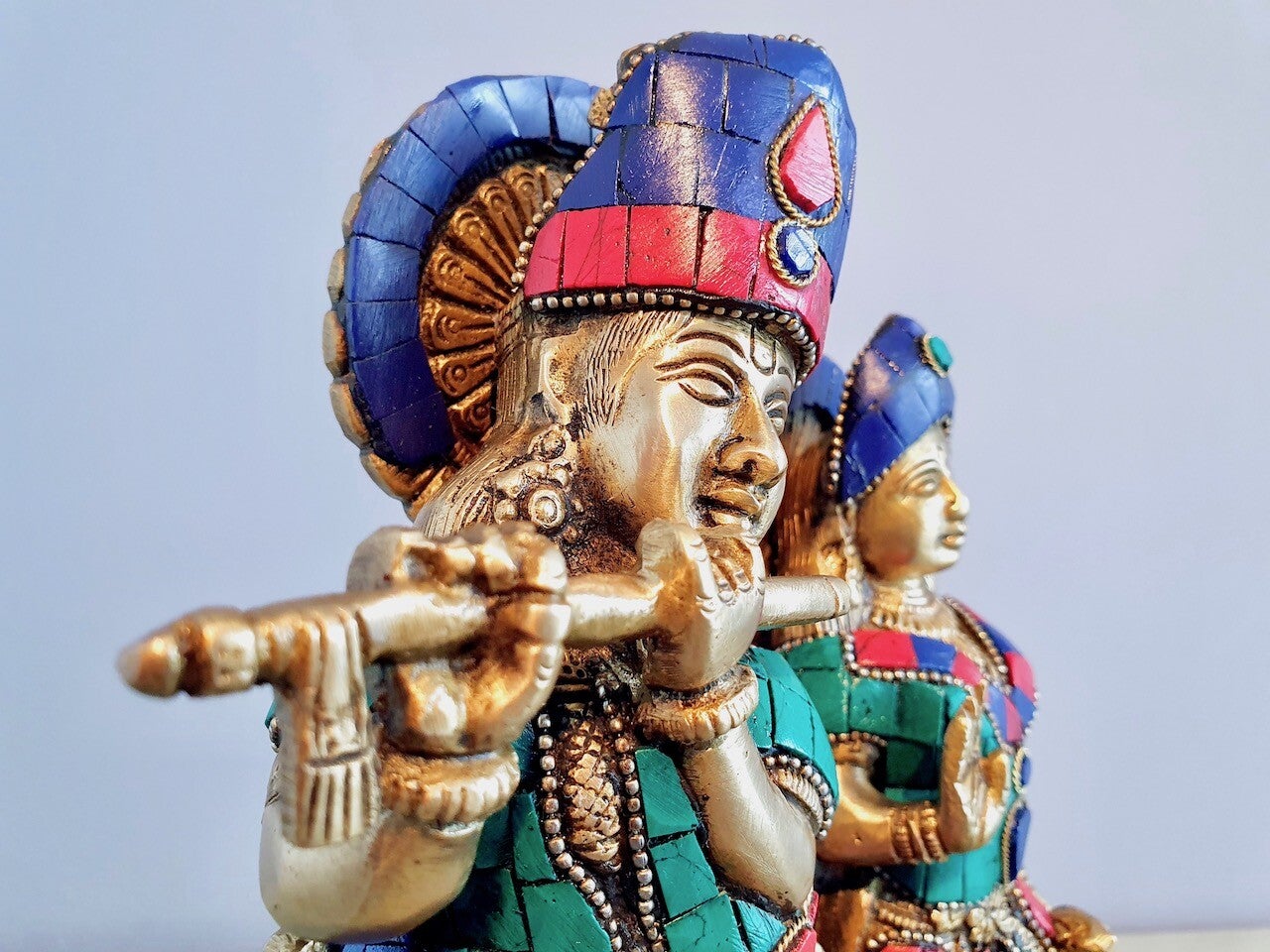 Een beeld van Radha en Krishna symboliseert de diepe spirituele liefde en eenheid tussen de goddelijke vrouwelijk en mannelijk principe. Krishna, de incarnatie van het goddelijke, wordt vaak afgebeeld met zijn geliefde Radha, die de essentie van devotie en liefde vertegenwoordigt. Radha is de ultieme aanbidder van Krishna, en hun relatie wordt gezien als een metafoor voor de ziel die zich verenigt met het goddelijke. Dit beeld staat voor liefde, harmonie, devotie, en de zoektocht naar spirituele verlichting door pure toewijding aan het goddelijke. Het benadrukt ook het belang van onvoorwaardelijke liefde en verbondenheid in de spirituele reis.