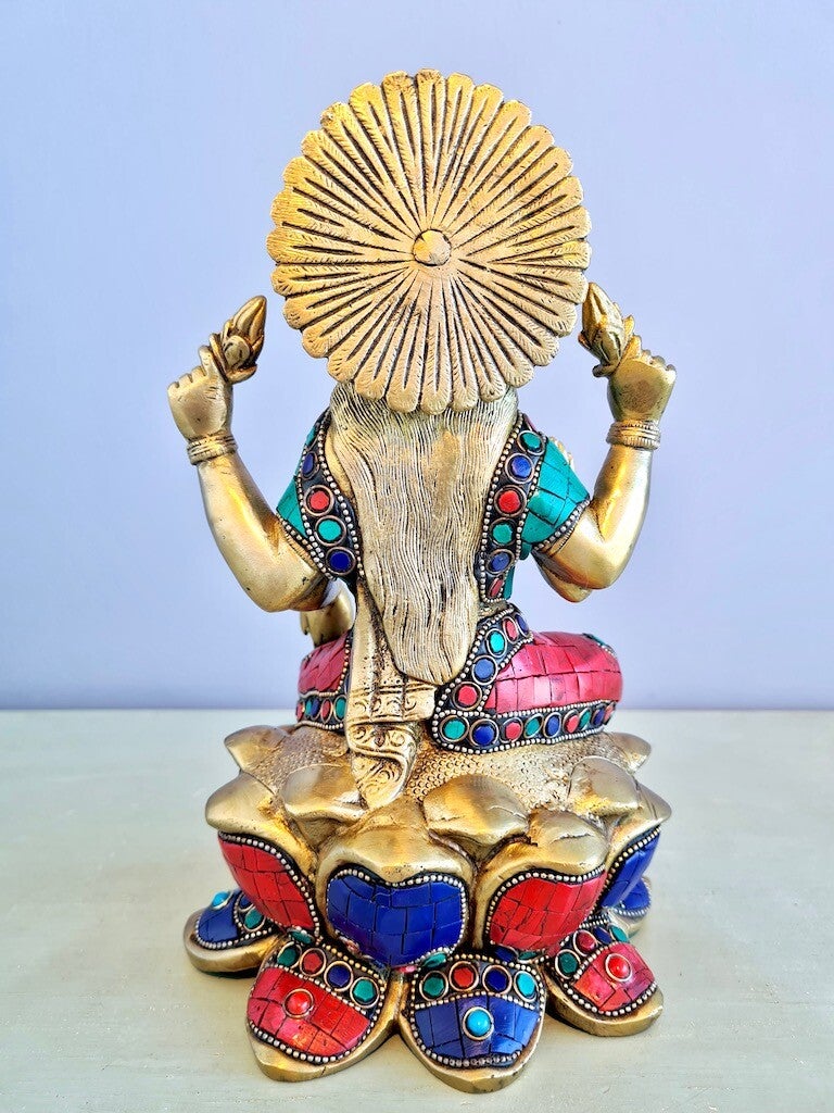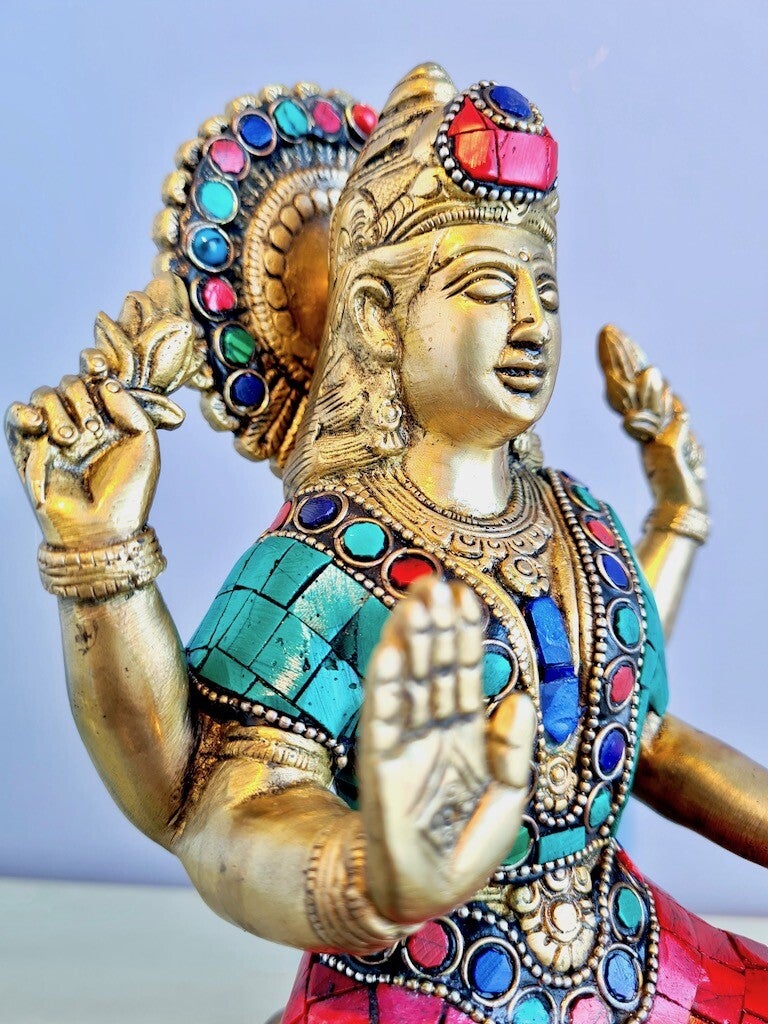 In tegenstelling tot Saraswati, is Lakshmi meestal afgebeeld met veel rijke sieraden, veel goud en veel geld.