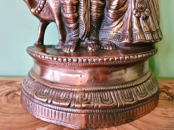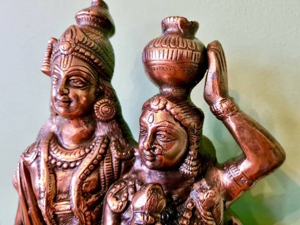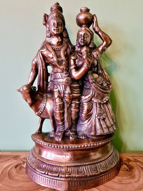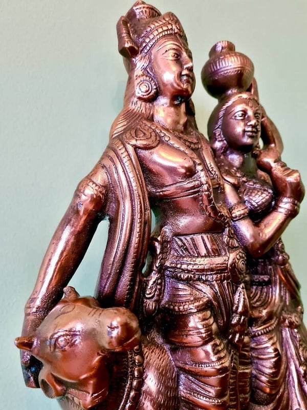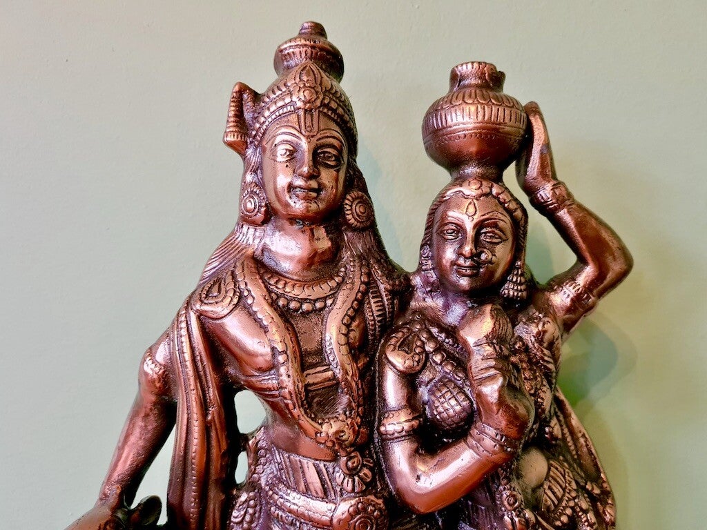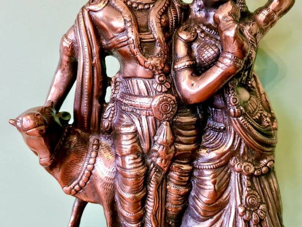 Een beeld van Radha en Krishna symboliseert de diepe spirituele liefde en eenheid tussen de goddelijke vrouwelijk en mannelijk principe. Krishna, de incarnatie van het goddelijke, wordt vaak afgebeeld met zijn geliefde Radha, die de essentie van devotie en liefde vertegenwoordigt. Radha is de ultieme aanbidder van Krishna, en hun relatie wordt gezien als een metafoor voor de ziel die zich verenigt met het goddelijke. Dit beeld staat voor liefde, harmonie, devotie, en de zoektocht naar spirituele verlichting door pure toewijding aan het goddelijke. Het benadrukt ook het belang van onvoorwaardelijke liefde en verbondenheid in de spirituele reis.