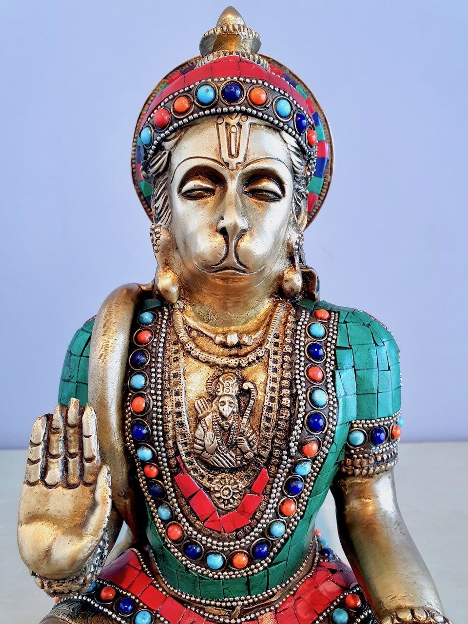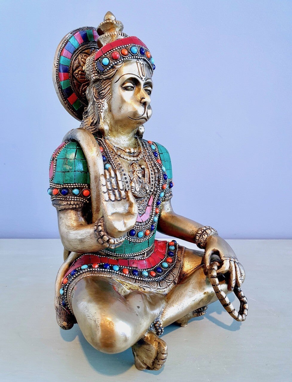 Hanuman had vele bovennatuurlijke eigenschappen en een lange staart en in de linkerhand de berg Gobardhan. In de rechterhand de knots (Gada), een krachtig middel om de juiste vijanden tegemoet te treden. Zo houdt Hanuman de gemanifesteerde wereld in stand door zijn enorme energie die hij in zichzelf vindt.