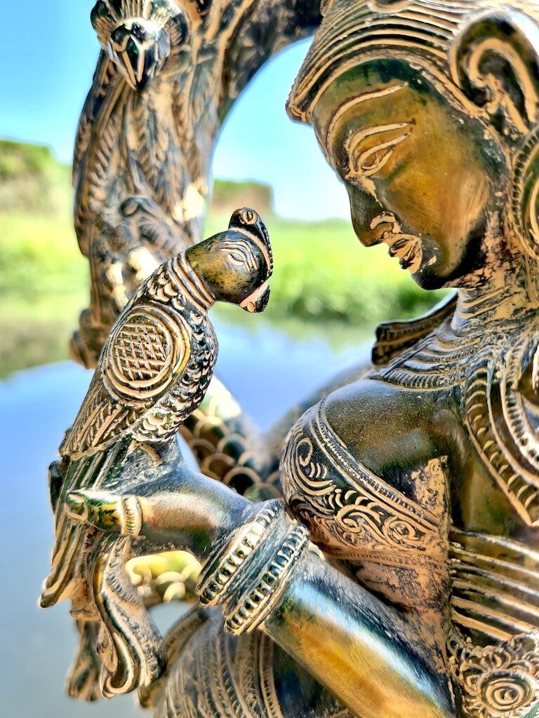 Dit zeer bijzonder bewerkte gegoten bronzen beeld van een jonge dame die een papegaai op haar hand houdt, onthult niet alleen een betekenis of de gemoedstoestand van de dame, maar een verhaal in vrijwel ieders leven van een jong hart in pijn wanneer haar geliefde van haar weg is. Om haar tijd door te brengen zonder haar geliefde heeft de pas getrouwde jonge dame een papegaai als haar vervangster voor de liefde. Terwijl ze met de vogel praat, lijkt ze al haar klachten en grieven die ze tegen haar partner had bij hem neer te leggen, hem misschien verwijtend dat hij haar, zelfs tijdelijk, verlaten heeft in het seizoen van de lente, wanneer zelfs de boomstronken barsten van de bloemen en de pijlen van de liefdesgod Kamadeva de meest doordringende zijn. Zij heeft het beste van haar sieraden en veel luxueuzere kledij bij zich, maar zonder de geliefde bij haar bijten ze haar alleen maar met meer doordringende steken.